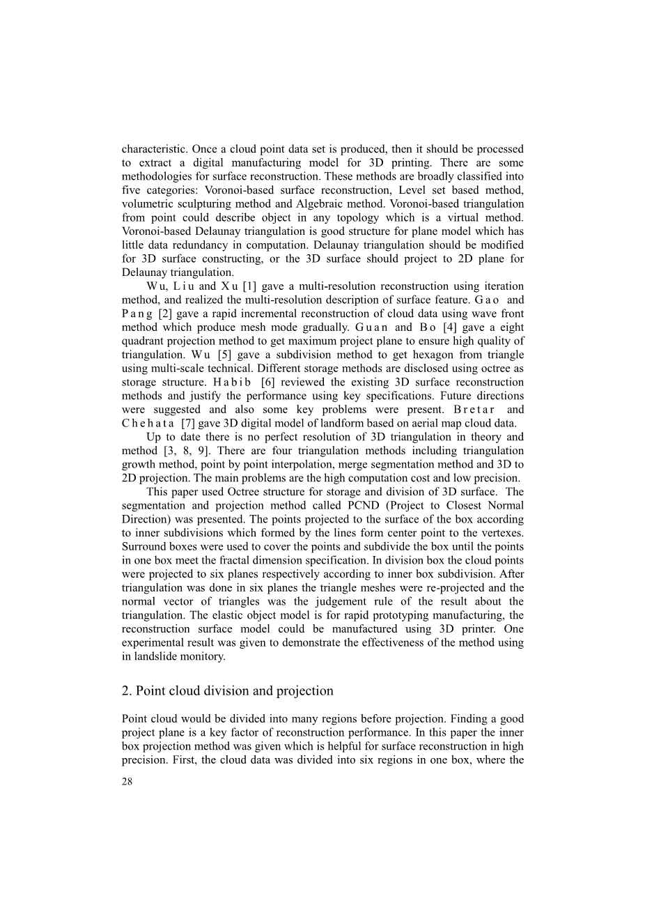 吴、刘、徐采用迭代法进行了多分辨率重建,实现了表面特征的多分辨率描述。高和庞利用逐步产生网格模式的波前法对云数据进行了快速增量重建。管和博给出了一种八象限投影法,以获得最大投影平面,保证三角测量的高质量。吴提出了一种利用多尺度技术从三角形中提取六边形的细分方法。采用八叉树作为存储结构,公开了不同的存储方法。Habib审查了现有的三维表面重建方法,并使用关键规范证明了性能。提出了今后的发展方向,并提出了一些关键问题。Bretar和Chehata基于航空地图云数据给出了地形的三维数字模型。迄今为止,三维三角测量在理论和方法上还没有完美的分辨率。三角剖分方法有四种:三角剖分生长法、逐点插值法、合并分割法和三维到二维投影法。主要问题是计算成本高、精度低。本文采用八叉树结构对三维曲面进行存储和划分。提出了一种新的分割投影方法PCND。根据由直线形成的内部细分,投影到盒子表面的点从中心点到顶点。包围盒用于覆盖点和细分框,直到一个框中的点符合分形维数规范。在分割盒中,云点根据内盒细分分别投影到六个平面上。在六个平面上进行三角剖分后,重新投影三角网格,三角法向量作为三角剖分结果的判定规则。弹性物体模型是一种快速成型制造方法,利用三维打印机可以制作出重构曲面模型。通过一次试验,验证了该方法在滑坡监测中的有效性。