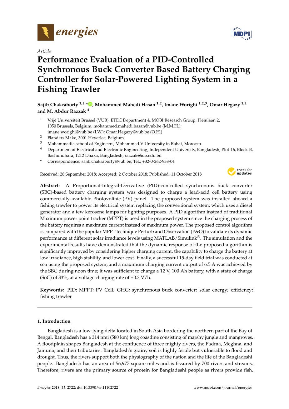 关键词:PID;MPPT;光伏电池;GHG;同步降压整流器;太阳能;效率;拖网渔船