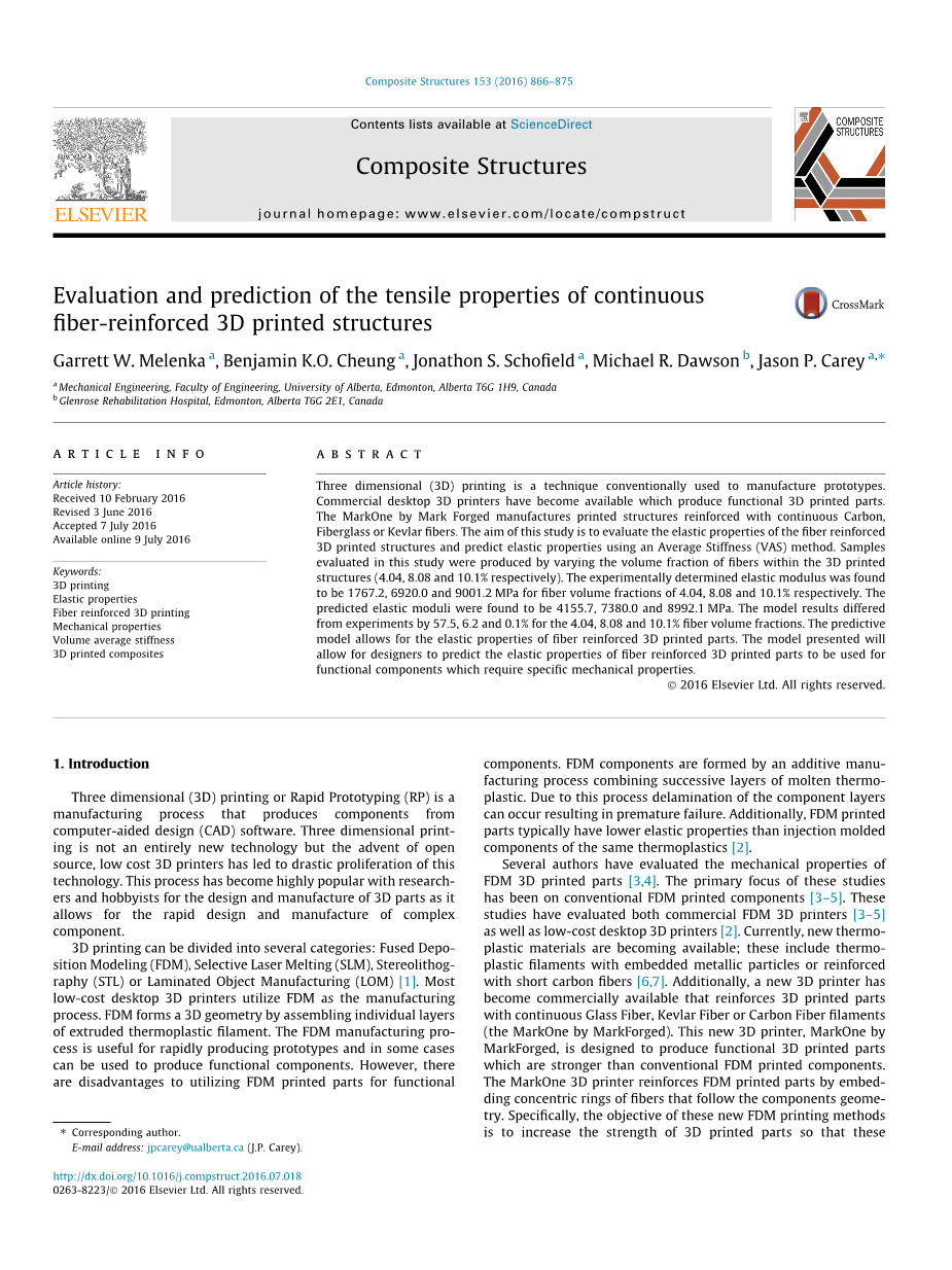 三维(3D)打印是传统上用于制造原型的技术。商用台式3D打印机已经可用于生产功能性3D打印部件。Mark Forged的MarkOne制造商印刷结构用连续碳增强,玻璃纤维要么凯夫拉尔纤维.这项研究的目的是评估弹性纤维增强3D打印结构和使用平均刚度(VAS)方法预测弹性性能。通过改变3D打印结构内的纤维的体积分数(分别为4.04,8.08和10.1%)来生产在该研究中评估的样品。实验确定弹性模量发现为1767.2,6920.0和9001.2 MPa纤维体积分数分别为4.04,8.08和10.1%。预测的弹性模量为4155.7,7380.0和8992.1MPa。对于4.04,8.08和10.1%纤维体积分数,模型结果与实验的不同之处为57.5,6.2和0.1%。预测模型允许纤维增强3D打印部件的弹性。所展示的模型将允许设计者预测用于纤维增强3D打印部件的弹性性质功能组件这需要特定的机械性能。