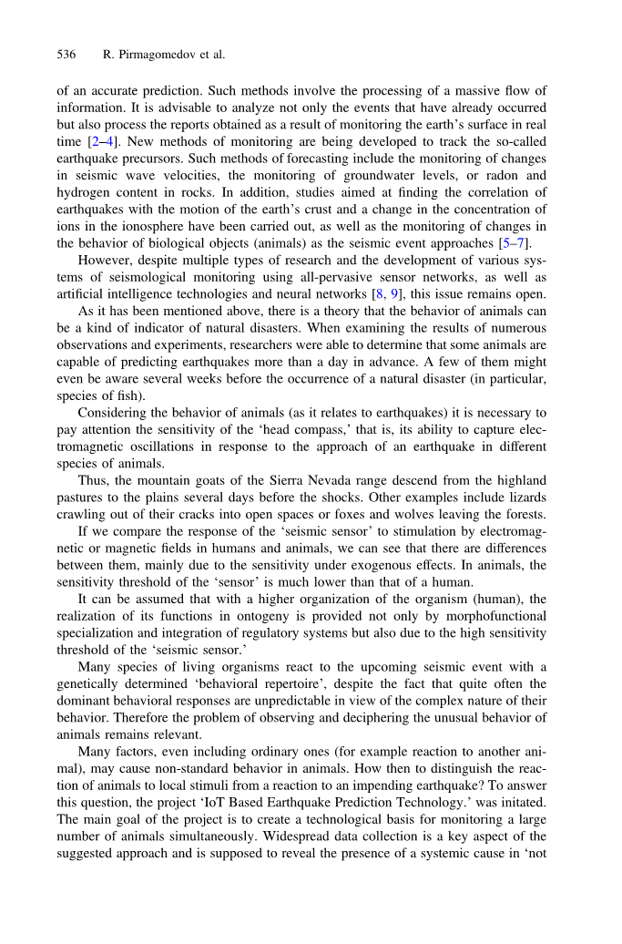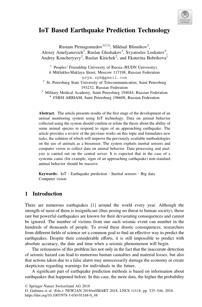摘要 本文介绍了使用物联网技术发展动物监测系统的第一阶段的研究现状。使用该系统采集的动物行为数据应该证实或反驳关于某些动物物种对接近地震的迹象作出反应的能力的论点。本文回顾了关于该主题以前的工作并制定了新的任务,其解决方案将改进以前可用的使用动物作为生物传感器的方法。该系统采用惯性传感器和计算机视觉来采集动物的行为数据。数据处理和分析在中心服务器上执行。预计在系统性原因的情况下(例如,接近地震的迹象),非标准性的动物行为应该是巨大的。