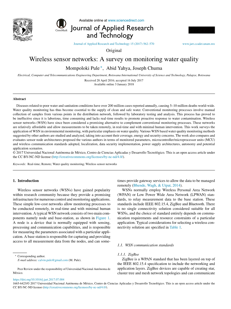 水传播疾病已成为人类健康的主要挑战。这类疾病每年大约有2.5亿例,造成全世界500万至1000万人死亡。因此,保证水质量无疑对维护人类的可持续文明具有重要意义。水质可以定义为特定情况下水的适用性,基于其化学,生物和物理特性。监测水质涉及检测其特征参数并将其与设定的标准进行比较。水质的能否接受通常是由通过判断其用途的标准来确定。监测水质的最大挑战之一是需要收集大量样本以确保准确可靠的分析。在这方面,手动方法不确定因素很多,麻烦并且效率低下。实时监控可实现预警功能,确保及时对水污染做出反应。这就是目前在水质检测这一领域彻底研究WSN的原因。另外,这些设备只需要相对较低的启动和维护成本,因此对于许多监控应用都显示出巨大的潜力。
