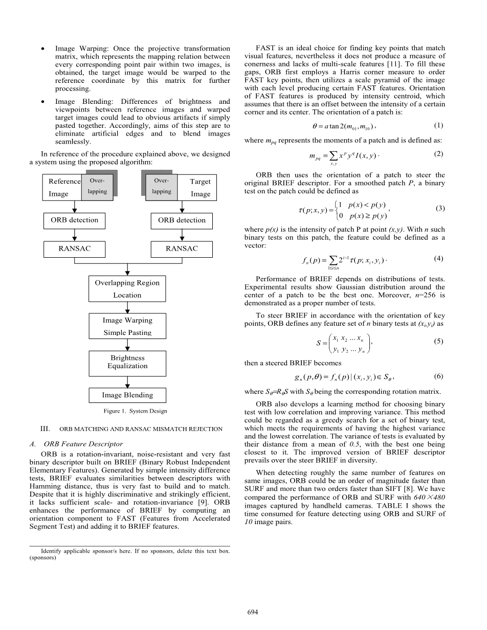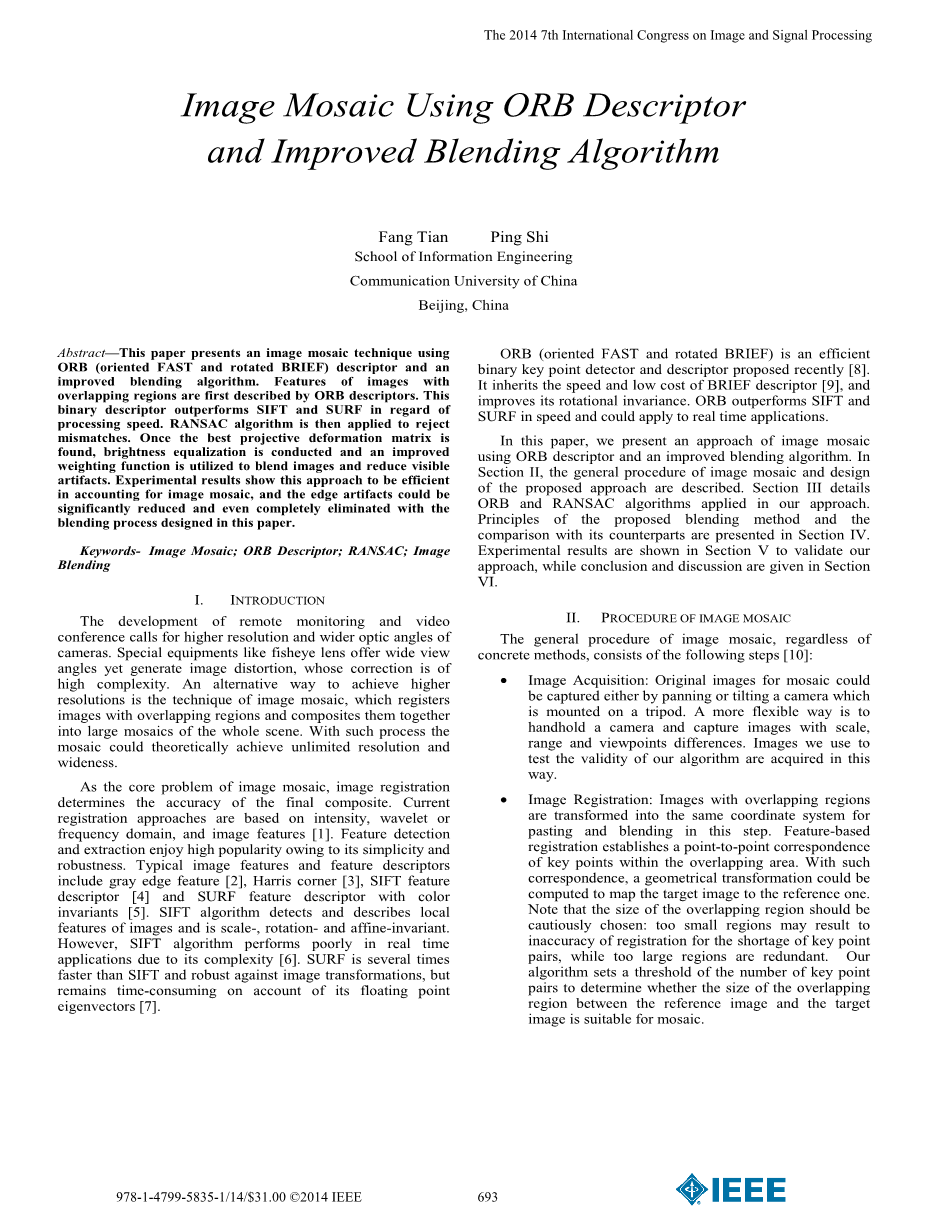 本文提出了一种基于ORB(面向FAST和旋转Brief)描述符的图像拼接技术和改进的融合算法。图像重叠区域的特征首先由ORB描述符描述。这个二进制描述符在处理速度上优于SIFT和SURF。然后应用RANSAC算法拒绝不匹配区域。一旦找到最好的投影变换矩阵,就会进行亮度均衡,改进加权函数用于拼接图像并减少可见伪影。实验结果表明这种方法在计算图像拼接时是有效的,并且在本文设计的融合过程中,边缘伪影可以显著减少甚至完全消除。
