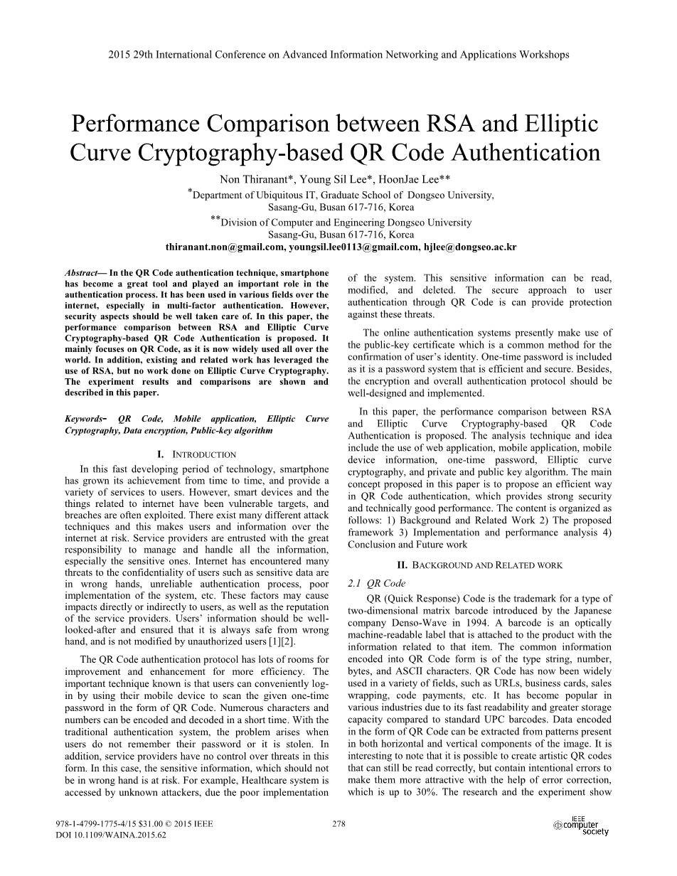 在QR二维码认证技术中,智能手机已经成为一种很好的工具,并在认证过程中发挥了重要作用。它已被用于互联网的各个领域,尤其是多重身份验证。然而,安全问题应该得到重视。 本文提出了基于RSA加密算法和椭圆曲线密码的QR码认证性能比较。主要介绍了现在在世界各地广泛使用的QR二维码。此外,现有的相关研究已经使用了RSA加密算法,但没有有关椭圆曲线密码学的相关工作。本文将展示和描述两种加密算法的实验结果和比较。