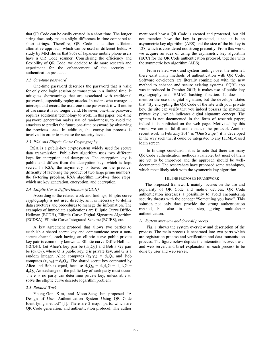 从这项工作中,我们获得了使用用于QR二维码认证协议的非对称密钥算法(ECC)和对称密钥算法(AES)的想法。从互联网上的相关工作和系统调查结果来看,存在许多使用QR码进行身份验证的方法。软件开发人员正在逐步采用新方法来增强和保护现有系统。SQRL应用程序于2013年10月推出; 它利用公钥密码学和HMAC哈希函数。它没有提到数字签名的使用,但开发者声明:“通过用您的私钥加密网站的QR二维码,网站可以验证您确实拥有匹配的私钥”,这表明数字签名的概念。该系统没有以研究论文的形式记录; 但它的确发布在网页上。受到这项工作的启发,我们决定要实现并加强协议。2014年2月的另一项新工作是“One Swipe”,它的开发方式使其可以集成到任何基于HTML的登录屏幕。