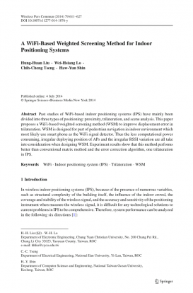 摘要 以往对基于wifi的室内定位系统(IPS)的研究主要分为三种类型:邻近法、三边测量法、场景分析法。这篇论文提出了一种基于wi - fi的加权滤波方法(WSM),用于改善三元数计算中的位移误差。WSM是为室内环境下的部分行人导航而设计的,其中最有可能使用智能手机作为WiFi信号探测器。因此,在设计WSM时要考虑到计算量小、APs部署位置不规则和RSSI变化不规则等因素。实验结果表明,该方法优于室内定位系统中传统的矩阵法和误差修正算法、三边测量法。