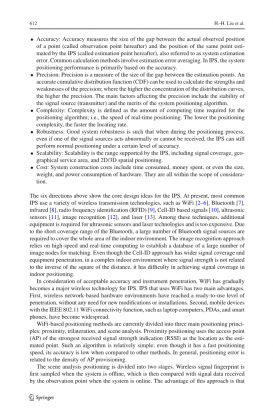 以上六个方向展示了IPS的核心设计思想。目前,最常见的IPS使用多种无线传输技术,如WiFi、蓝牙、红外、射频识别(RFID)、基于蜂窝id的信号、超声波传感器、图像识别和激光。在这些技术中,超声波传感器和激光技术需要额外的设备,而且太昂贵。由于蓝牙的覆盖范围较短,所以需要大量的蓝牙信号源来覆盖整个室内环境区域。图像识别方法依赖于高速实时计算去建立一个包含大量图像节点的数据库进行匹配。尽管Cell-ID方法具有更广泛的信号覆盖和设备穿透能力,但是在复杂的室内环境中,信号强度与距离平方反比无关,在室内定位中难以实现信号覆盖。