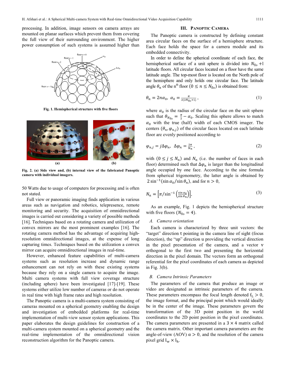 普通苍蝇的视觉系统是这个高级硬件视觉系统的灵感来源。普通的苍蝇有两只眼,它由数千个简单的传感器[1]组成。这些传感器的组合为飞行提供了全方位视觉。这种生物激发的平面视觉概念是可实现的,通过将CMOS图像传感器分层放置在球面几何形状上,形成一个全方位的相机[2],进一步可以被称为“全景”。全景照相机有两大特点。首先,它是一种全向相机,能够记录来自其中心周围任何方向的光信息。第二,它是一个多折射系统;每个CMOS facet是一个微型相机,有独立的焦平面。因此,整个系统是一个相互的孔径相机。CMOS成像器是分层的,使得每个面的视场与它的邻居的视场重叠。一种全方位的多折射相机对某些逆视觉问题是理想的,如自运动估计或结构的运动提取,其证明在[3]。此外,由于每个孔径面的视场重叠,全景相机也是一种光学相机[3],因此,这种提供了具有深度地图估计能力的全景相机,是一个3D摄像机的核心特征。本文阐述了全景摄像机全向视觉的重建算法。系统地分析了器件的局限性和性能。提出了一种基于fpga的实时应用开发硬件平台。论文的结构如下。第二部分回顾了建立多摄像头视频系统的前期工作。在第三节中介绍了全景相机的配置和相机参数。第四部分介绍了全向视觉重建的展示全景的镜头。第五部分给出了覆盖分析方法。本文提出了一种基于全向视觉重建算法的全向视觉重建算法的FPGA平台,并给出了成像结果。第七部分总结全文。