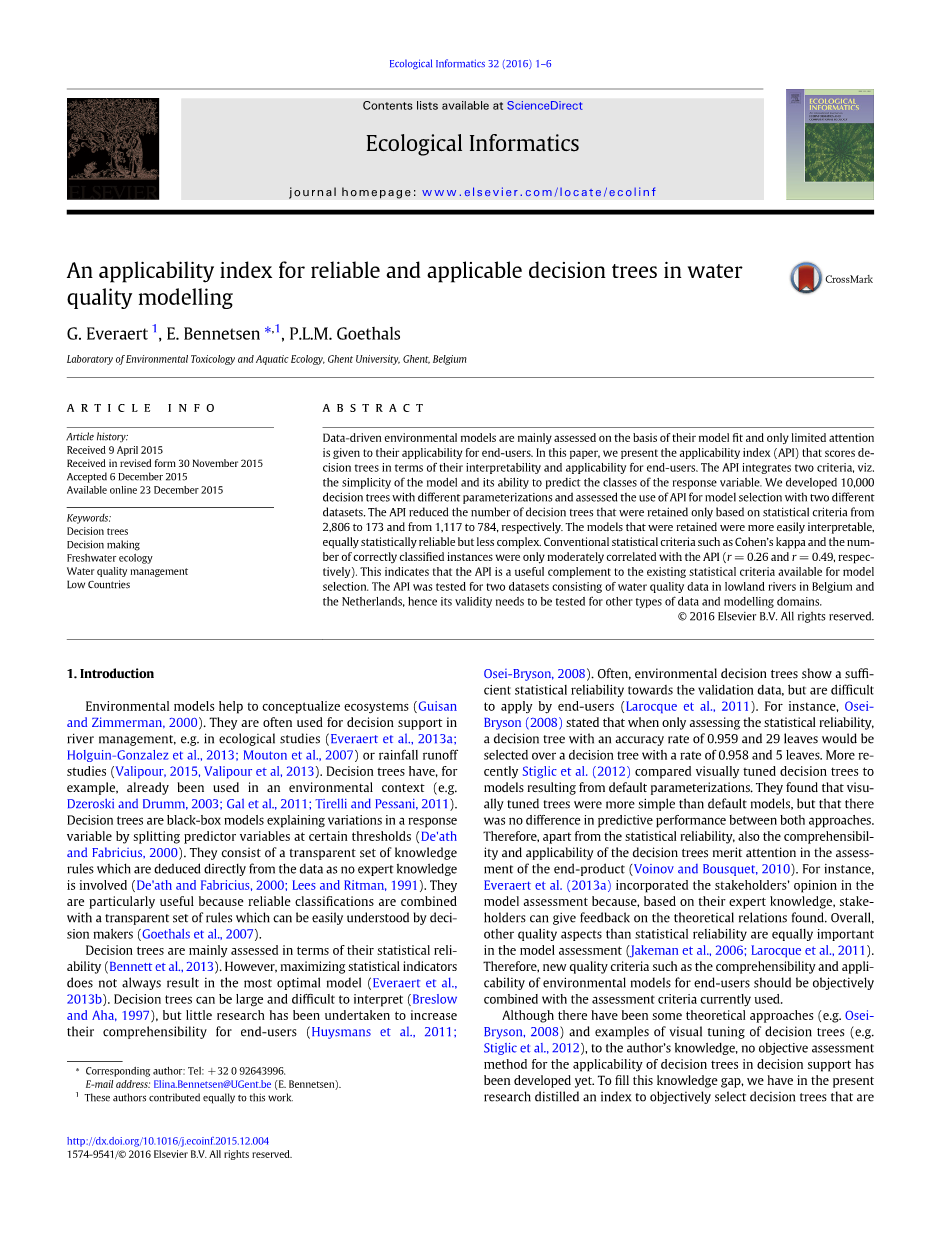 决策树主要用统计可靠性来评估(Bennett 等., 2013)。然而,统计指标的最大化并不总是指向最优化的模型(Everaert 等., 2013b)。决策树可以很大且很难被解释(Breslow 和 Aha, 1997),但是很少有研究承担起提高最终用户对其理解度的责任(Huysmans 等., 2011; Osei-Bryson, 2008)。通常,对于验证数据,环境决策树显示出足够的统计可靠性,但难以被最终用户所应用(Larocque 等.,2011)。例如,OseiBryson(2008)指出,只评估统计可靠性时,将在决策树上选择准确率为0.959和29叶子节点的决策树而不是准确率为0.958和5叶子节点的决策树。最近Stiglic等人(2012)将可视化调整的决策树与通过默认参数产生的模型进行了比较。他们发现,通过可视化调整的决策树比默认模型的决策树更简洁,但两种方法的预测性能没有差异。因此,除了统计可靠性之外,决策树的可理解性和适用性在最终产品的评估中值得关注(Voinov 和 Bousquet, 2010)。例如,Everaert等人(2013a)将权益人的观点纳入模型评估中,因为根据他们的专业知识,利益相关者可以对所发现的理论关系给出反馈。总体而言,其他质量方面的统计可靠性在模型评估中同样重要(Jakeman 等., 2006; Larocque 等., 2011)。因此,新的质量标准,如环境模型对于最终用户的可理解性和适用性,应当被客观地结合到当前的评估标准中。虽然已经有一些理论方法(e.g. OseiBryson, 2008)和决策树可视化调整的例子(e.g. Stiglic 等., 2012),根据作者所知,决策树在决策支持中适用性的客观评估方法尚未被开发。为弥补这一缺陷,我们在本研究中提出了一个指标,来客观地选择对最终用户(例如决策者)有用的决策树。适用性指数(API)评估决策树的简洁性和可解释性。 API通过集成视觉简单性和预测响应变量的所有类别的能力,客观而透明地量化模型对最终用户的有用程度。我们分析了两个包括法兰德斯(比利时)和荷兰地表水水质数据的大范围数据集,并根据常规使用的统计标准测试了模型选择中适用性指数的附加值。最后,API的鲁棒性是在独立验证的基础上评估的。