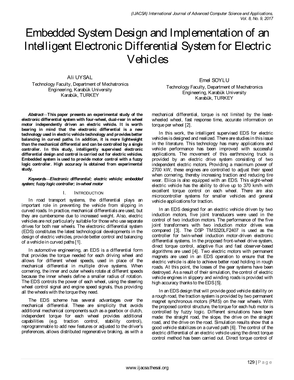 摘要—本文针对双后轮独立驱动的电动汽车提出了电子差速系统的试验研究。 值得记住的是电子差速系统是一种应用于电动汽车上的新技术,其在弯曲路径的处理上具有更好的平衡性。此外,它比机械差速器更轻,可以通过单个控制器进行控制。 在这项研究中,智能监控电子差速器在电动车上得到实现。嵌入式系统通过模糊逻辑控制器提供电机控制。并且从试验中得到更高的精度
