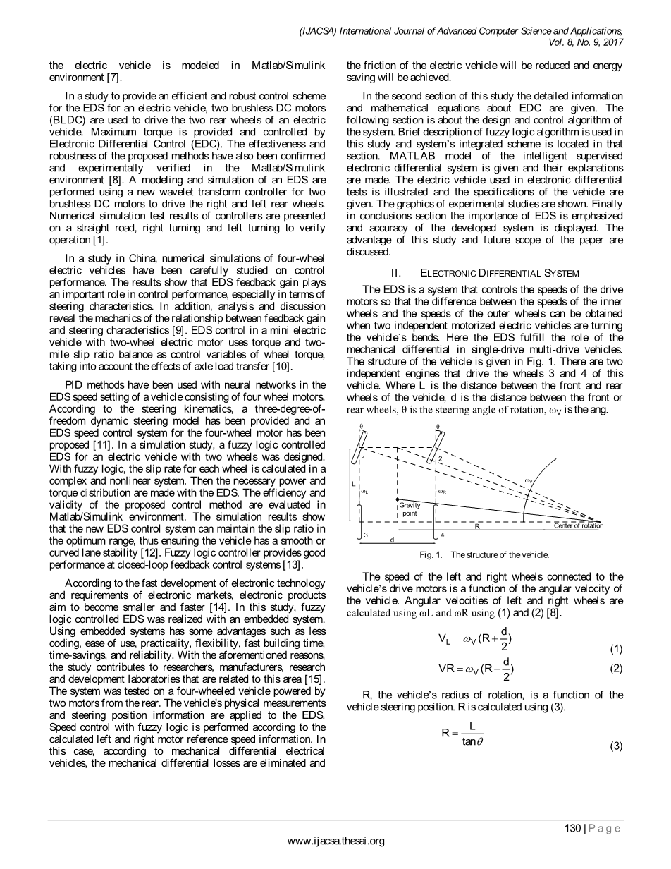 在本研究的第二部分中,给出了关于电子差速控制的详细信息和数学公式。 以下部分是关于系统的设计和控制算法。 本研究采用模糊逻辑算法,包括系统的集成方案。 给出了智能控制电子差速系统的MATLAB模型并给出了解释。用于电子差速测试的电动车辆并给出了车辆的规格。 显示实验研究的图形。 最后,在结论部分中,强调了电子差速系统的重要性并展示了所开发系统的准确性。 对电子差速器的发展未来进行了讨论。