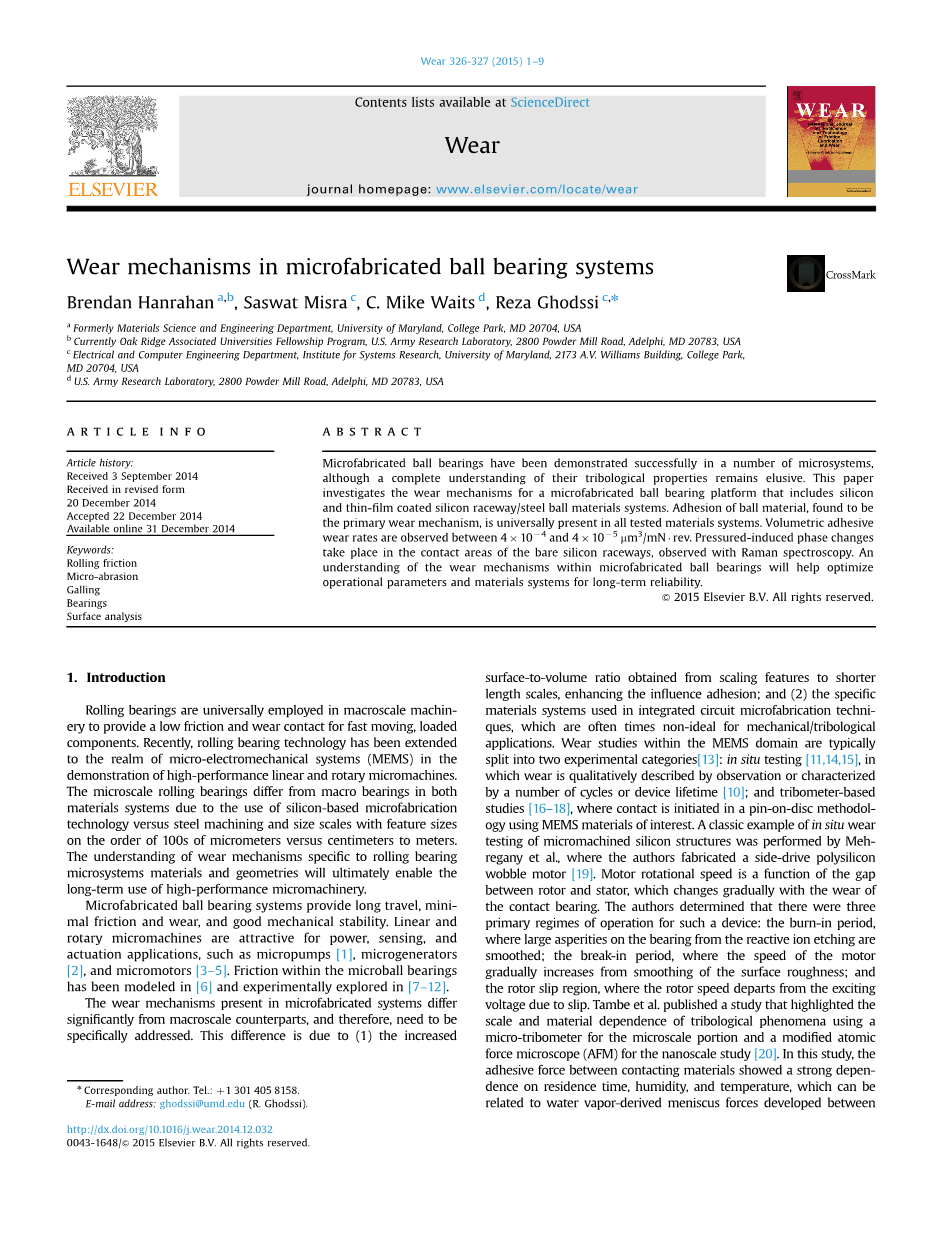 滚动轴承广泛应用于宏观机械中,为快速移动的负载组件提供低摩擦和磨损接触。最近,在高性能线性和旋转微机械的演示中,滚动轴承技术已经扩展到微机电系统(MEMS)领域。微型滚动轴承与两种材料系统中的宏轴承不同,这是因为使用硅基微细加工技术与钢材加工相结合,尺寸规格与特征尺寸相差数百微米至厘米至数米。对滚动轴承微系统材料和几何形状特有的磨损机制的理解最终将使高性能微机械的长期使用成为可能。