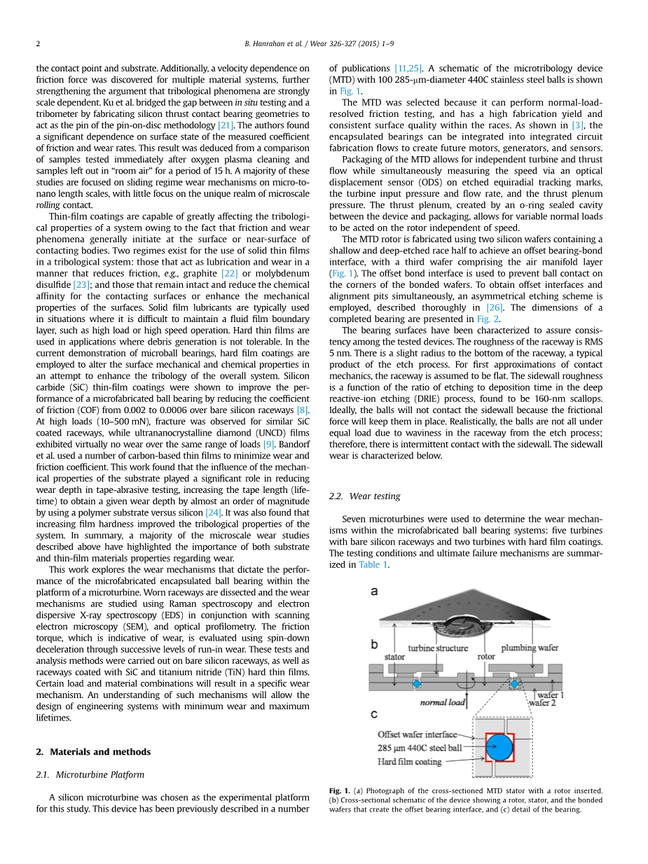 七台微型涡轮机用于确定微型滚珠轴承系统中的磨损机理:五个带有裸硅滚道的涡轮机和两个带硬膜涂层的涡轮机。 测试条件和最终失效机制在表1中概括。