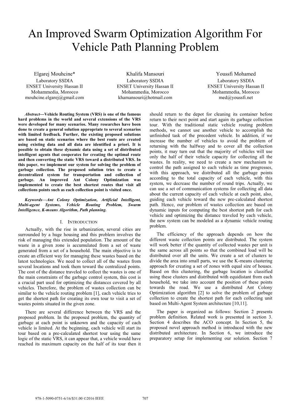 摘要-车辆路径选择系统(VRS)是世界上最著名的硬件问题之一,VRS的许多扩展都是针对许多场景开发的。很多研究人员已经做了工作来创建适合于几种情况的通用解决方案,但反馈有限。此外,现有提议的解决方案基于静态方案,其中使用现有数据创建最佳路线并且所有数据优先地被识别。使用一组分布式智能代理可以获得这些动态数据,这些智能代理协作创建最佳路线,然后将静态VRS转换为分布式VRS。在本文中,我们实现了解决垃圾收集问题的系统。提出的解决方案试图建立一个垃圾运输和收集的分散系统。实施改进的蚁群优化以创建访问所有集合点的最佳最短路线,例如每个集合点被访问一次。