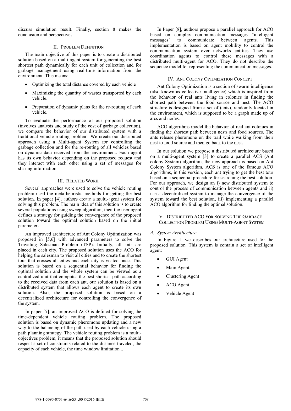 我们使用分布式蚁群优化算法[2]来解决垃圾收集问题,为每个采集单元创建基于多智能体系统结构的最短路径[10,11]。本文组织如下:第2节提出问题定义。相关工作在第3节中介绍。第4节介绍了ACO概念。在第5节中,提出的新颖的方法是在新的分布式体系结构中引入的。 在第6节中,我们介绍实施解决方案的准备工作。 第7节讨论模拟结果。最后,第8节得出结论和观点。