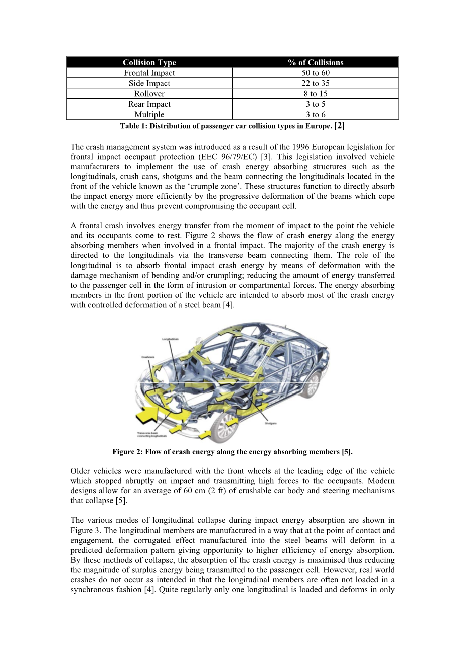 纵向技术已被纳入现代乘用车中,目的是在正面碰撞期间管理冲击能量以减轻驾驶员伤害的严重程度。冲击能量被特定模式(弯曲和/或折皱)的纵向变形吸收。这种影响能量管理方法的有效性以及因此减轻真实世界碰撞中的伤害尚未明确。