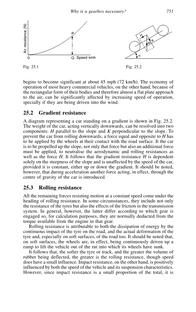 图25.2显示了代表一辆车站在梯度上的汽车。 垂直向下作用的汽车重量可分解为两部分:平行于斜坡的H和垂直于斜坡的K。 为防止汽车向下滚动,车轮在与路面接触时必须施加与H相等且相反的力。 它必须在斜坡上行驶,不仅需要施加力,还需要施加额外的力,以抵消空气动力学和滚动阻力以及力H.因此,坡度阻力H仅取决于坡度陡峭,并且不受车速影响,只要坡度恒定,不论是在坡度上还是坡度上。 然而,应该注意的是,在加速过程中,另一个实际上通过汽车重心作用的力被引入。
