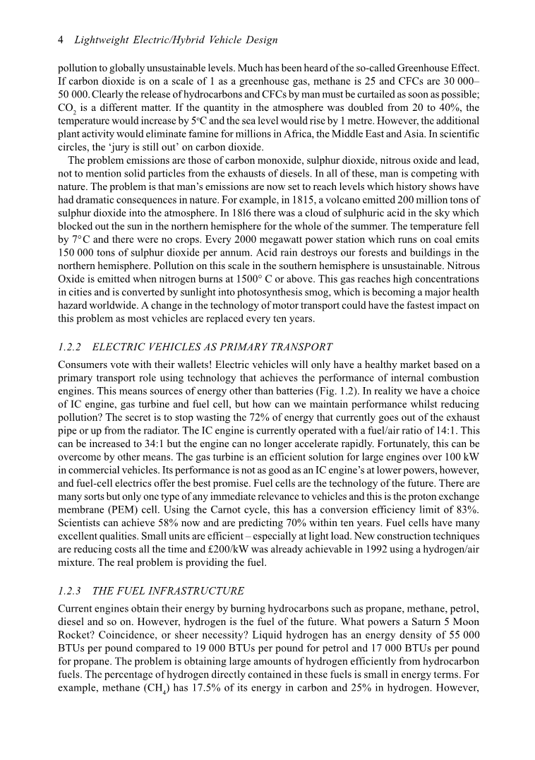 目前世界汽车数量达7亿,其中超过6亿属于G7经济体。这个数字在未来十年将增加到约10亿。预计这种增长的大部分将发生在人均第二世界国家收入已达到已知开始购车的水平。这有两个严重的问题影响(图1.1):碳氢燃料使用量大幅增加,污染增加到全球不可持续发展的水平。很多人都听说过所谓的温室效应。如果二氧化碳的温室气体排放量为1,则甲烷为25,而氟氯化碳为30 000-50 000。很显然,人类必须尽快减少碳氢化合物和氟氯化碳的释放量;CO2是另一回事。如果大气中CO2的数量从20%增加到40%,那么温度会增加5℃和海平面会上升1米。但是,额外的植物活动将消除非洲,中东和亚洲数百万人的饥荒。在科学界,二氧化碳的“陪审团”仍是个问题。