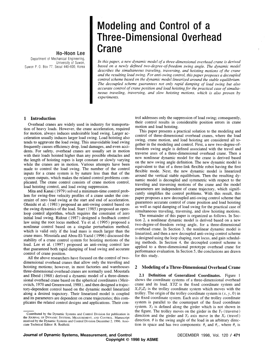 Mita和Kanai解决了一个起重机在起动和停止时零负载摆动约束下无摆动速度特性的时间最优控制问题[1]。Ohnishi 等人提出了一个基于负载摆动动力学的防摆控制策略[2]。Starr提出了一个需要无初始负载摆动开环控制策略[3]。Ridout用根轨迹法设计了一个反馈控制律[4]。Yu等人基于一级摆模型提出了一个仅在负载质量远大于起重机质量情况下的非线性控制策略[5]。Moustafa和Abou-El-Yazid讨论了桥式起重机控制系统起升负载运动的稳定性[6]。Lee等人提出了一个保证负载快速消摆和起重机精确定位控制的防摆控制律[7]。
