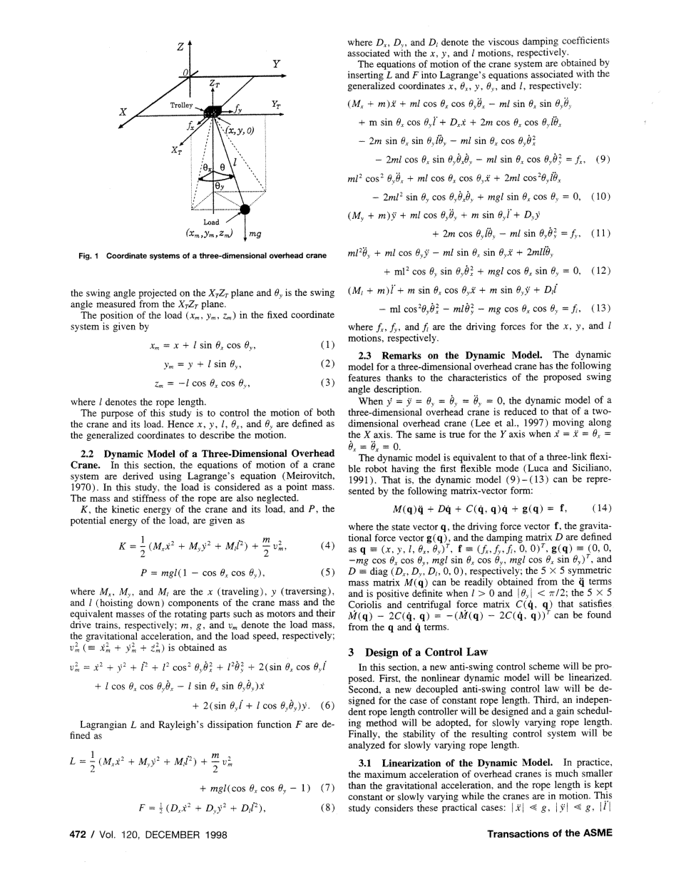 上述所有研究人员都关注只允许平动和起升的二维桥式起重机的控制。但是,在大多数工厂和仓库,三维桥式起重机才是更常见的。Moustafa和Ebeid导出了基于球坐标的三维桥式起重机动力学模型[8][9][10],并且之后设计了一种基于沿期望轨迹动力模型线性化的动态轨迹控制方法。他们的线性化模型是耦合的,且其参数依赖于起重机轨迹,这使得相关的控制设计和应用复杂化。他们的控制只解决了负载摆动的抑制问题,因此,他们的控制会在起重机运动和负载起升中产生相当大的定位误差。