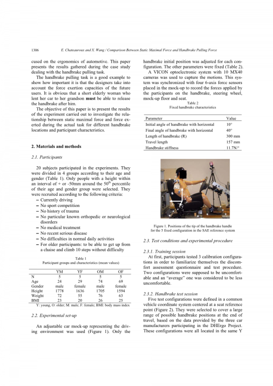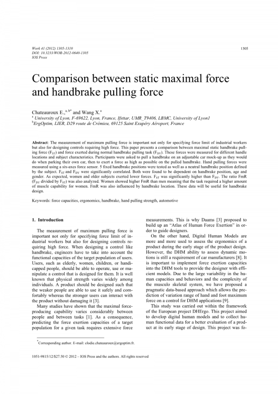 On the other hand, Digital Human Models are more and more used to assess the ergonomics of a product during the early stage of the product design. However, the DHM ability to assess dynamic motions is still a requirement of car manufacturers [8]. It is important to implement force exertion capacities into the DHM tools to provide the designer with efficient models. Due to the large variability in the human capacities and behaviors and the complexity of the musculo skeletal system, we have proposed a pragmatic data-based approach which allows the prediction of variation range of hand and foot maximum force on a control for DHM applications [9]. This study was carried out within the framework of the European project DHErgo. This project aimed to develop digital human models and to collect human functional data for a better evaluation of a product at its early stage of design. This project was focused on the ergonomics of automotive. This paper presents the results gathered during the case study dealing with the handbrake pulling task.