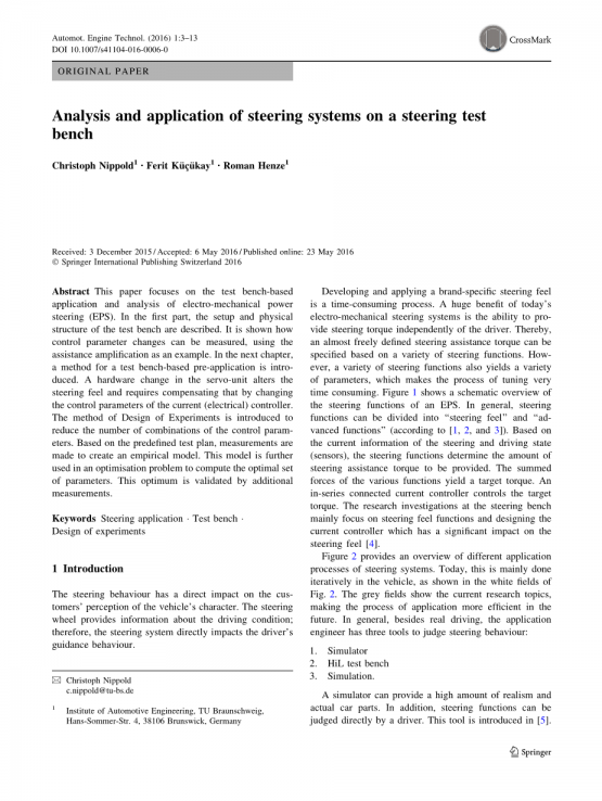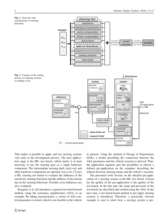 Koegeler等人[8]介绍了一个通用的测试试验台基础方法,使用援助放大(ASA)作为一个例子。通过采用测量工具,各种ASA控制参数被测试,这在一般的车辆中是不可行的。使用实验设计方法(DoE),模型描述ASA参数和车辆的反应之间的联系。从而,应用工程师有可能选择一个定义在计算机上的预应用程序描述转向扭矩与车辆反应之间的关系。介绍的工作重点是在HIL试验台上的转向系统的详细的预申请。对预申请质量关键的是试验台的质量。在第一部分,描述了试验台的设置和精度,并且使用ASA进行验证。下一步,介绍了预先应用于转向系统的基于测试台的方法。因此,实际上示例用于说明转向系统如何预先应用于定义的参考行为。在布伦瑞克大学的汽车工程研究所,他最后的一部分工作是对如何分析和评价转向系统提出未来展望。