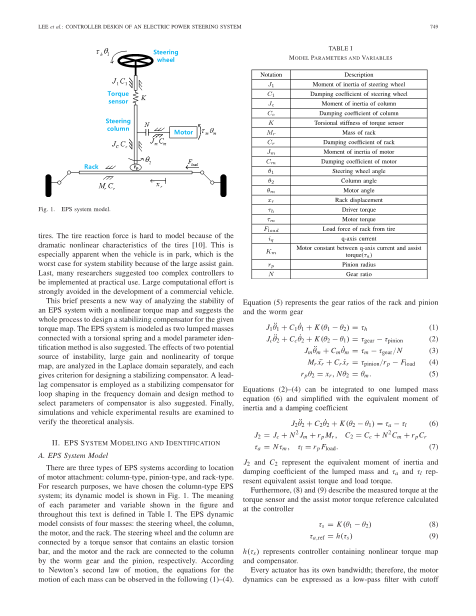 根据电机附件的位置,有三种类型的EPS系统:柱式,小齿轮式和齿条式。出于研究目的,我们选择了柱式EPS系统;其动力学模型如图1所示。图1和图表中所示的每个参数和变量的含义如表1所示.EPS动态模型由四个质量块组成:方向盘,立柱,电机和机架。方向盘和立柱通过包含弹性扭杆的扭矩传感器连接,电动机和齿条分别通过蜗轮和小齿轮与立柱连接。根据牛顿的第二运动定律,可以在下面的(1)-(4)中观察每个质量的运动方程。