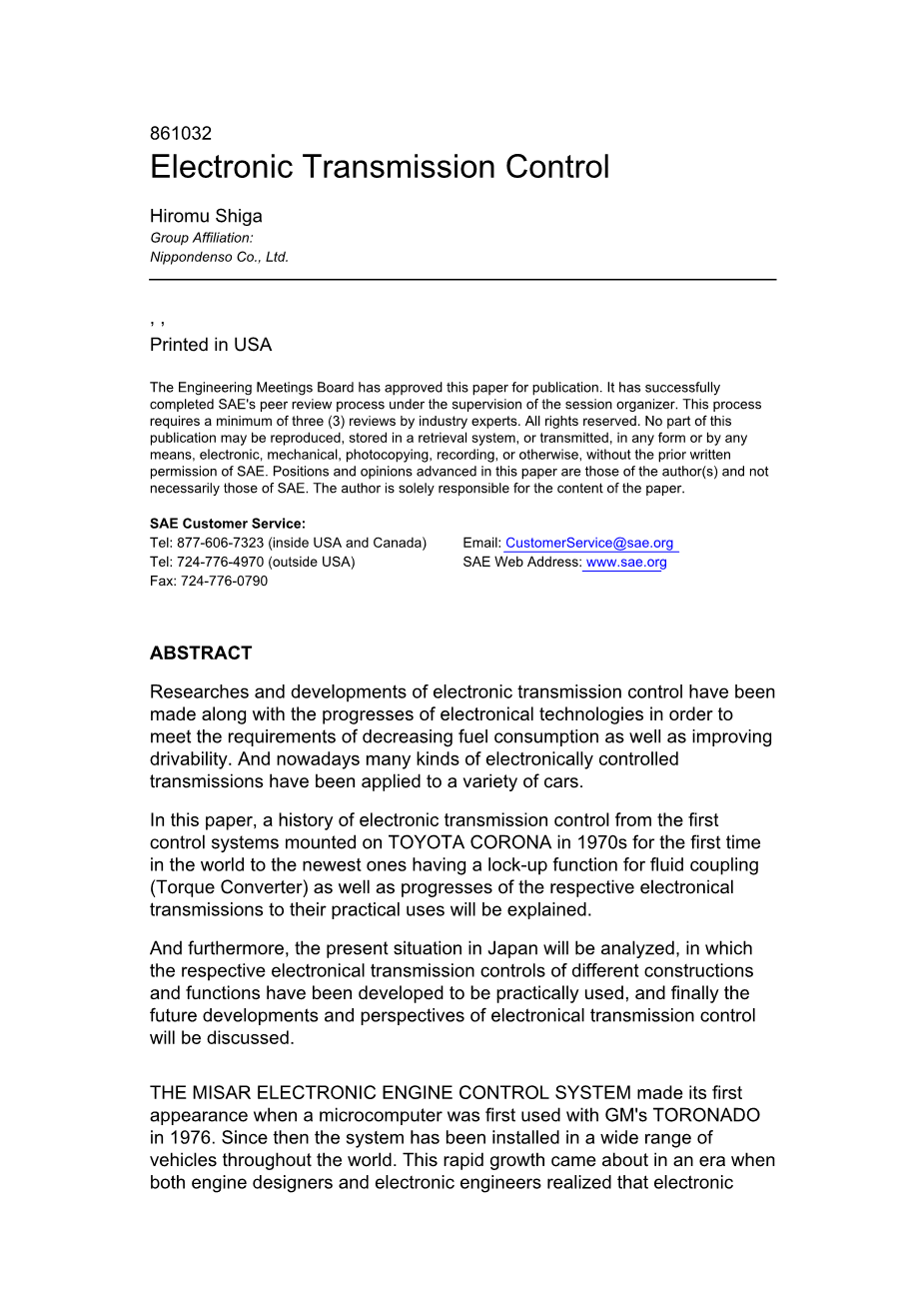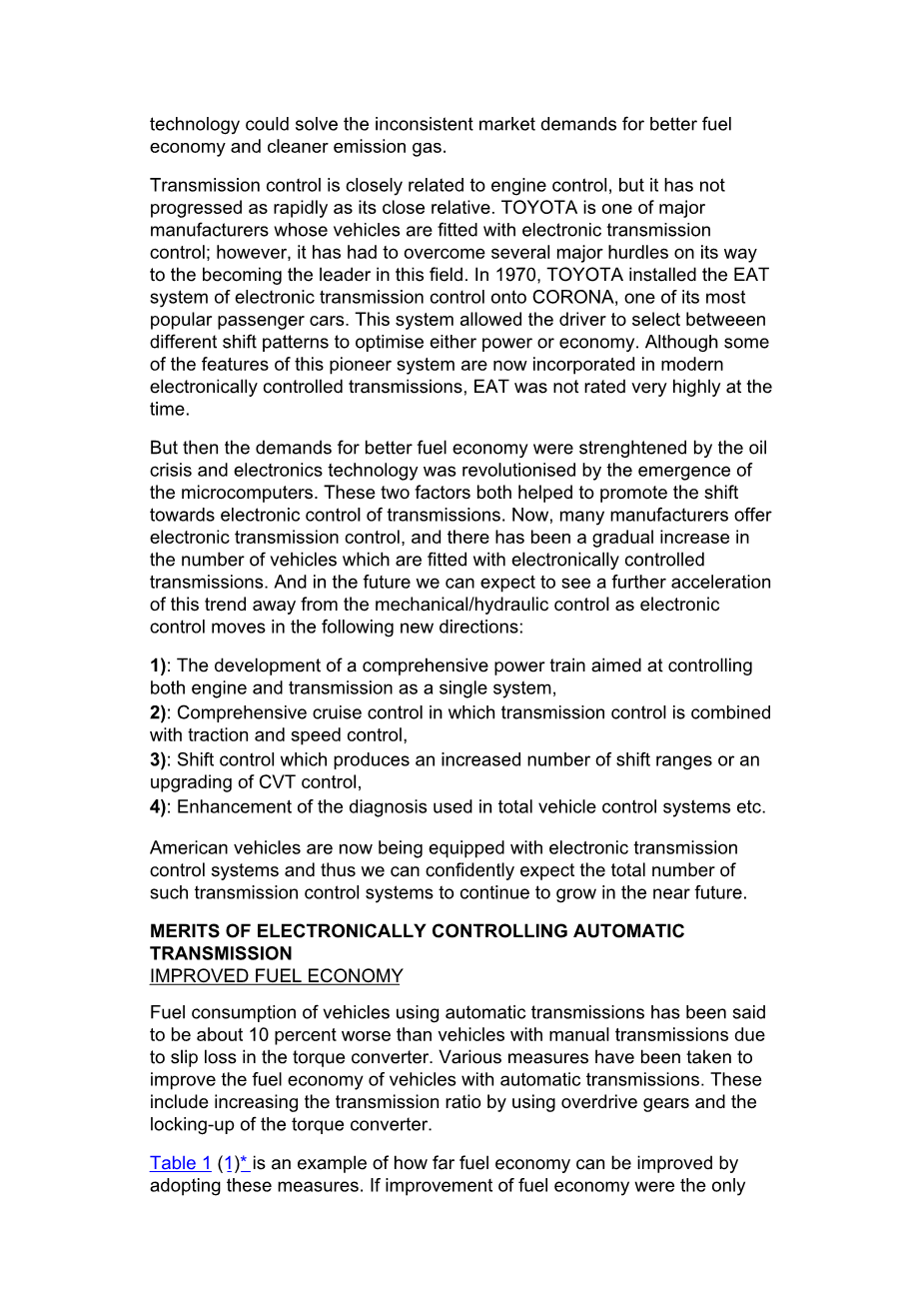 随着电子技术的进步,电子传动控制技术的研究已经取得了很大进展,基本能够满足降低燃油消耗和提高驾驶性能的要求。目前,多种电子控制变速器已应用于各种汽车。