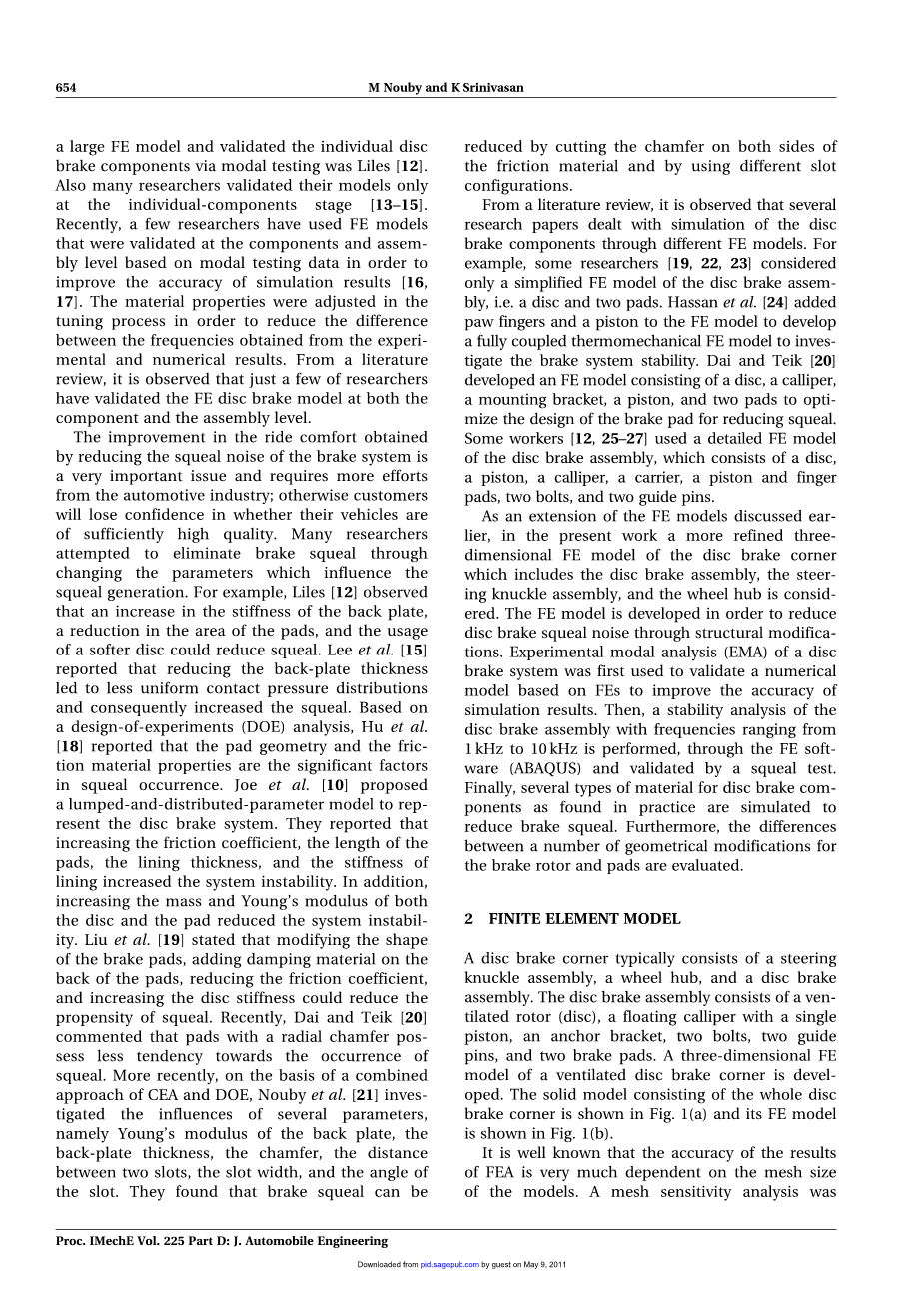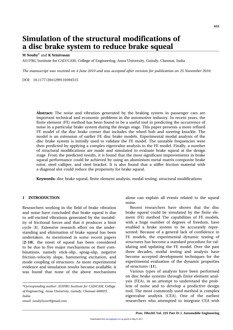摘要:轿车制动系统中噪声和振动的产生是汽车工业中重要的工艺和经济问题。近年来,有限元法被发现是预测某一制动系统在设计阶段噪声产生的有效工具。本文提出了一种更精确的盘式制动器转角有限元模型,该模型包括轮毂和转向节。该模型是对早期有限元盘式制动器模型的扩展。对盘式制动系统进行了试验模态分析,初步验证了有限元模型的正确性。然后将复特征值分析应用到有限元模型中,对不稳定频率进行预测。最后,进行了一些结构修改,并对设计阶段的制动啸叫进行了仿真计算。预测结果表明,采用铝基复合制动转子、钢制卡箍和钢支架,可以最大程度地改善制动啸叫。研究还发现,具有斜缝的刚性摩擦材料可以降低制动啸叫的倾向。