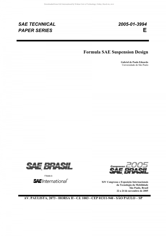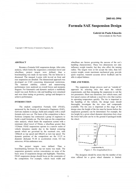 摘要:简述Formula SAE悬架设计。分析规则之后,规则限制了悬架的最小行程和轴距,定义了项目目标,然后对顶级车队进行基准测试。讨论了轮胎的行为。详细介绍了前后悬挂带有拉杆的不等A臂。尺寸方法是在CAD上开发的,涉及尺寸限制。在整体力和力矩图上分析了瞬态稳定性,控制和机动性能。对于运动学和动态分析,使用多体模型。模拟侧倾,举升和操纵,并对几何形状,弹簧和阻尼器进行调整以实现悬架性能。