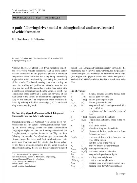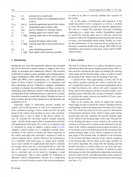 特别地,单点或多点预瞄模型广泛用于文献以及商用车辆仿真库中。这些模型预瞄车辆前方的路径并计算驾驶员控制系统中用作输入的误差值(位置,航向)。为了计算必要的控制变量(转向角—油门/制动输入),要么使用具有适当固定增益的比例控制器[5],要么使用自适应控制模型计算最佳值[1,6,8]。自适应控制模型使用简化的车辆内部表示来预测车辆的未来轨迹并调整控制器的响应以实现最佳的驾驶员控制。然而,具有固定增益或简单增益调度的控制器的性能更适合于需要模拟普通驾驶员而非专业驾驶员。此外,这种类型的控制器的使用提供了一致的驱动器行为,并且可以通过改变一小组参数来调整。这更适合评估不同的车辆配置,因为在比较过程中,我们需要保持尽可能多的系统不变为了能够正确找到结果变化的原因。