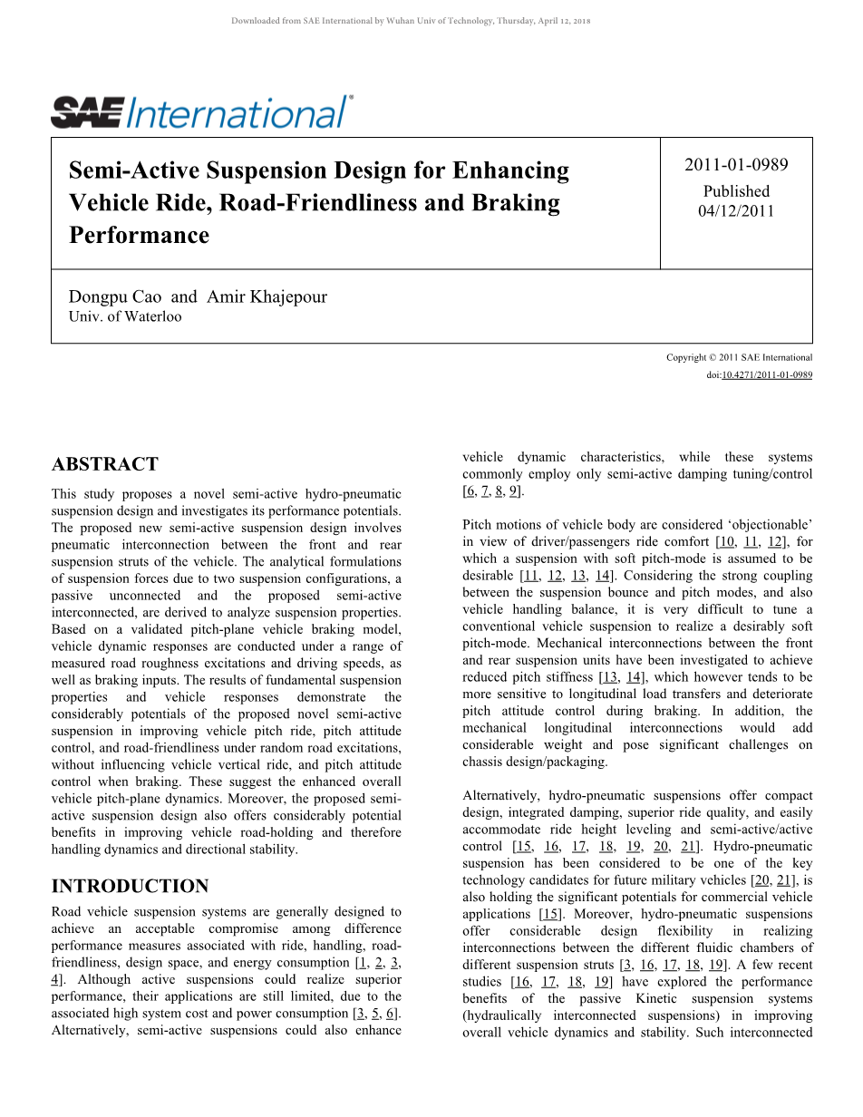 本文提出了一种新颖的半主动液压悬架设计,并对其性能进行了研究。提出的新型半主动悬架设计涉及车辆前后悬挂支板之间的气动互连。摘要分析了悬架结构的悬架结构、被动无连通和半主动互联两种悬架力的分析公式,并对悬架性能进行了分析。基于一种已验证过的空车制动模型,车辆的动力响应是在一系列测量的道路粗糙度和驱动速度以及制动输入的范围内进行的。根据基础悬架性能和车辆响应的结果表明,提出的新型半主动悬架在提高车辆俯仰、俯仰姿态控制和道路友好性等方面具有相当的潜力,在随机路面的情况下,不影响车辆的垂直行驶和制动时的俯仰姿态控制。这些建议增强了整体车辆的颠簸动力学。此外,所提出的半主动悬架设计也为改善车辆的道路控制提供了相当大的潜在效益,因此可以处理动力学和航向稳定性。