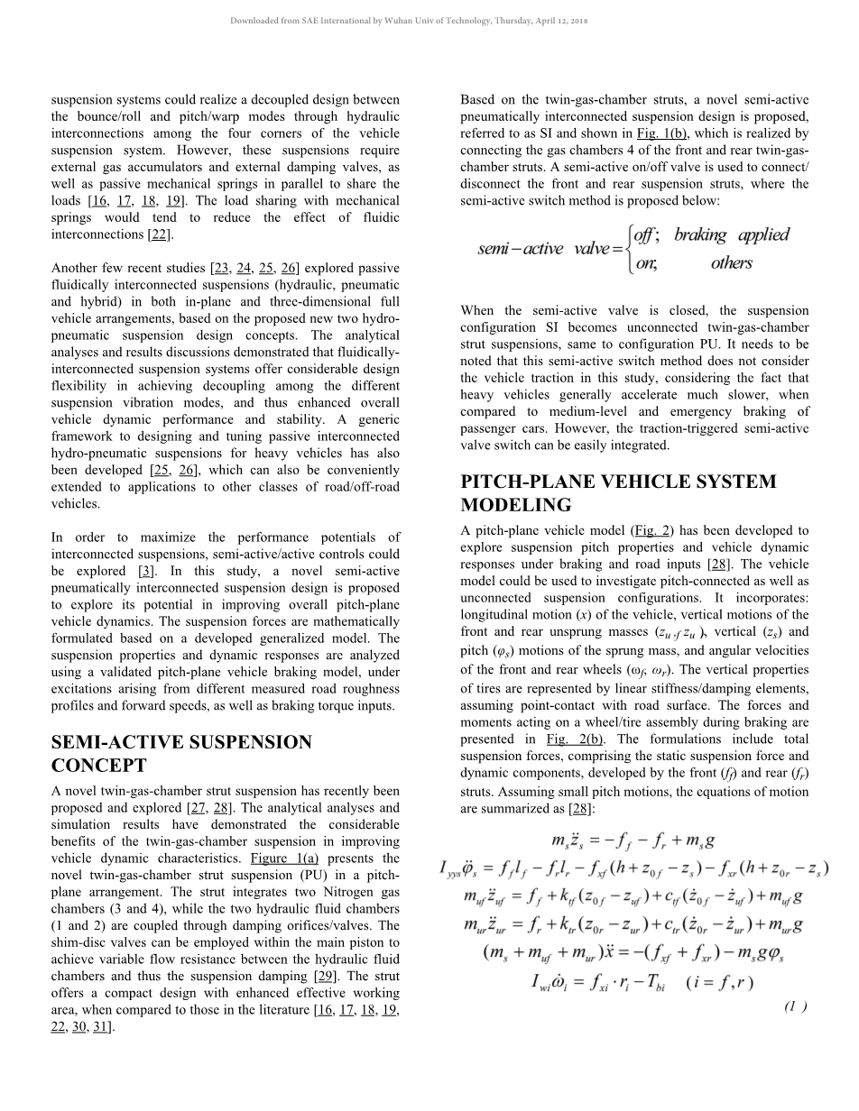 为了最大限度地发挥互连悬架的潜在性能,可以对半主动和主动控制进行探索[3]。在本研究中,提出了一种新型的半主动气动悬架设计,以探讨其在提高整体纵平面车辆动力学性能方面的潜力。在不同测量路面粗糙度、前进速度和制动力矩输入的情况下,基于一个已开发的广义模型的数学公式的悬浮力分析采用了一种经过验证的空载车辆制动模型的悬架特性和动力响应。