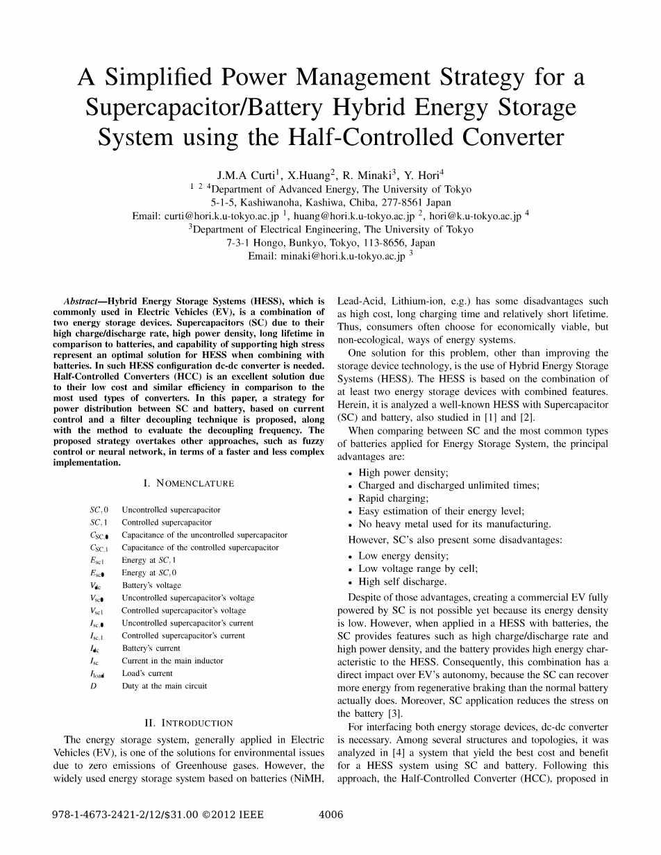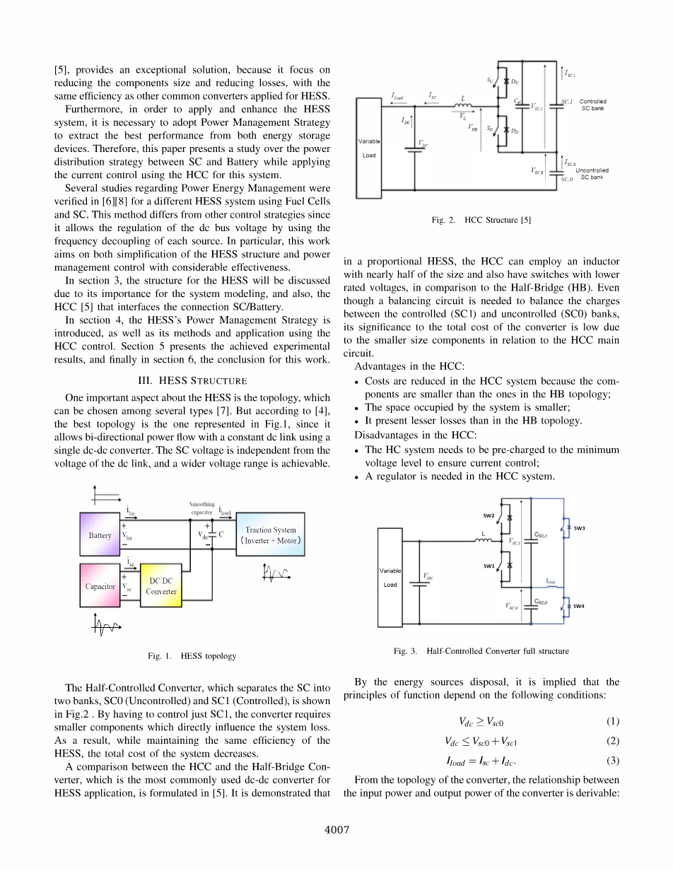 为了连接两个能量存储设备,DC-DC转换器是必要的。根据几种结构和拓扑,在[4]中分析了一个系统,该系统为使用超级电容器和电池的HESS系统产生最佳成本和收益。采用这种方法后,在[5]中提出的半控制转换器(HCC),提供了一个特殊的解决方案,因为它专注于减少元件尺寸和减少损耗,与应用于HESS的其他常见转换器相同的效率。