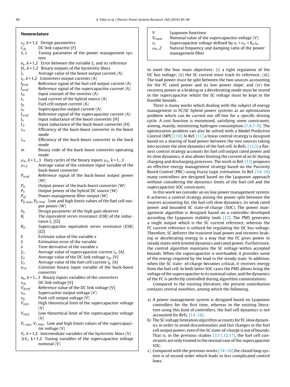 在这项工作研究中,我们考虑设计一个在线电源管理系统。这个系统实现了一种控制策略,旨在解决燃料源慢速动态,弱额定功率和有限SC充电状态(SOC)之间的功率分配问题。功率管理算法是基于根据Lyapunov稳定性工具[17]开发的控制器而设计的。PMS生成单个输出是SC电流参考,而FC电流参考用于调节直流母线电压。因此,SC提供瞬态负载功率并回收制动或减速的能量,这使得FC能以稳定的状态在有限的动态和额定功率下提供功率。此外,控制算法将SC电压保持在可接受范围内。当超级电容器过载时,它提供稳定状态下负载所需的一些能量。另外,当SC状态变得比较危急时,它从燃料电池接收能量。在后两种SOC情况下,PMS允许超级电容器的电压达到其标称值,并且在算法换向期间完全控制FC的动态。