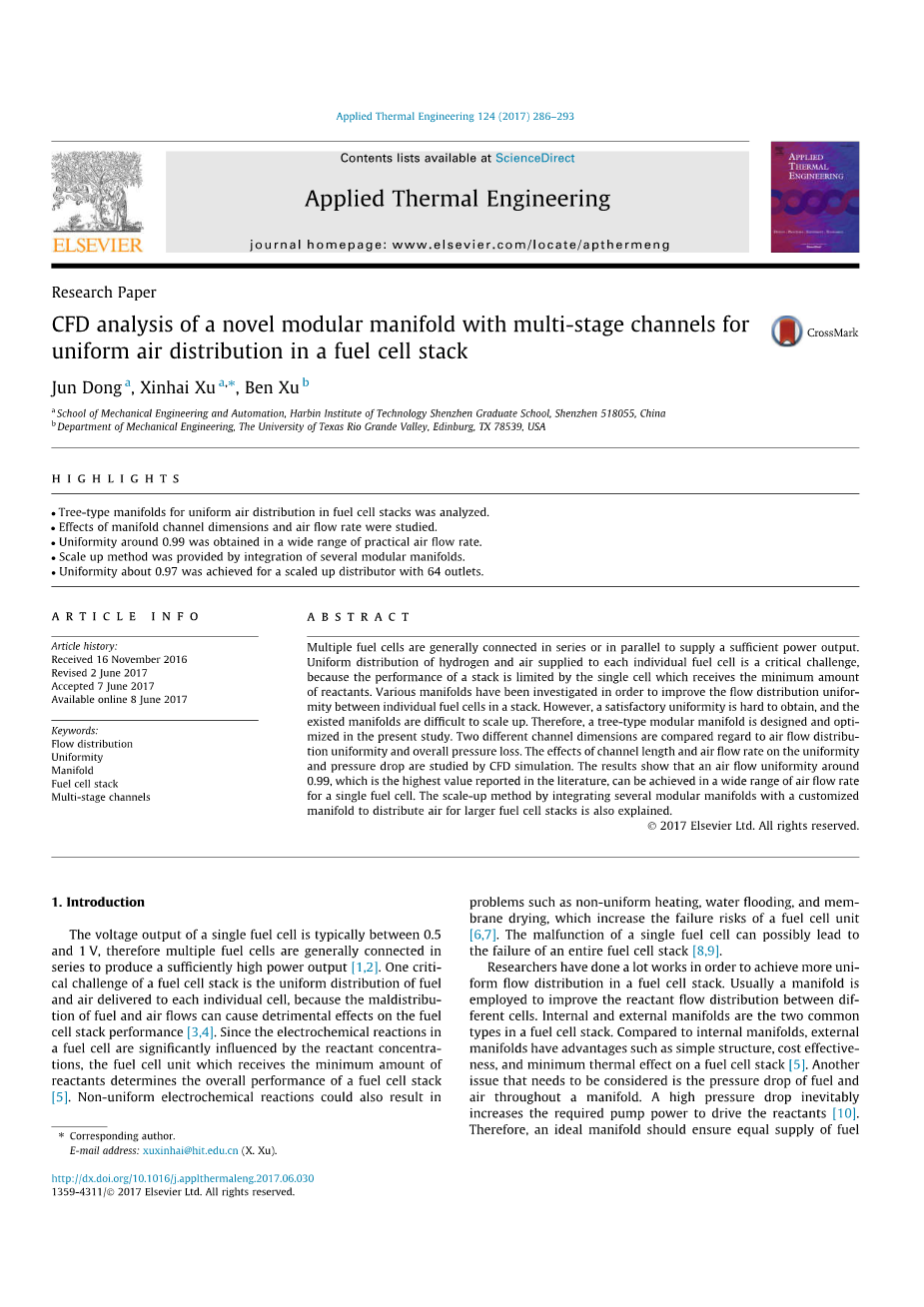 单个燃料电池的电压输出通常在0.5和1 V之间,因此多个燃料电池通常串联连接以产生足够高的功率输出[1,2]。燃料电池堆的一个关键挑战是燃料和空气输送到每个单独电池并且让它们均匀分布,因为燃料和空气流的分布不均匀会对燃料电池堆性能造成非常不利影响[3,4]。由于燃料电池中的电化学反应受反应物浓度的显著影响,因此最小燃料电池单元决定了燃料电池组的整体性能[5]。不均匀的电化学反应也可能导致很多问题,诸如加热不均匀性,水淹和膜干燥等问题,这增加了燃料电池单元的故障风险[6,7]。单个燃料电池的故障也有可能导致整个燃料电池堆的故障[8,9]