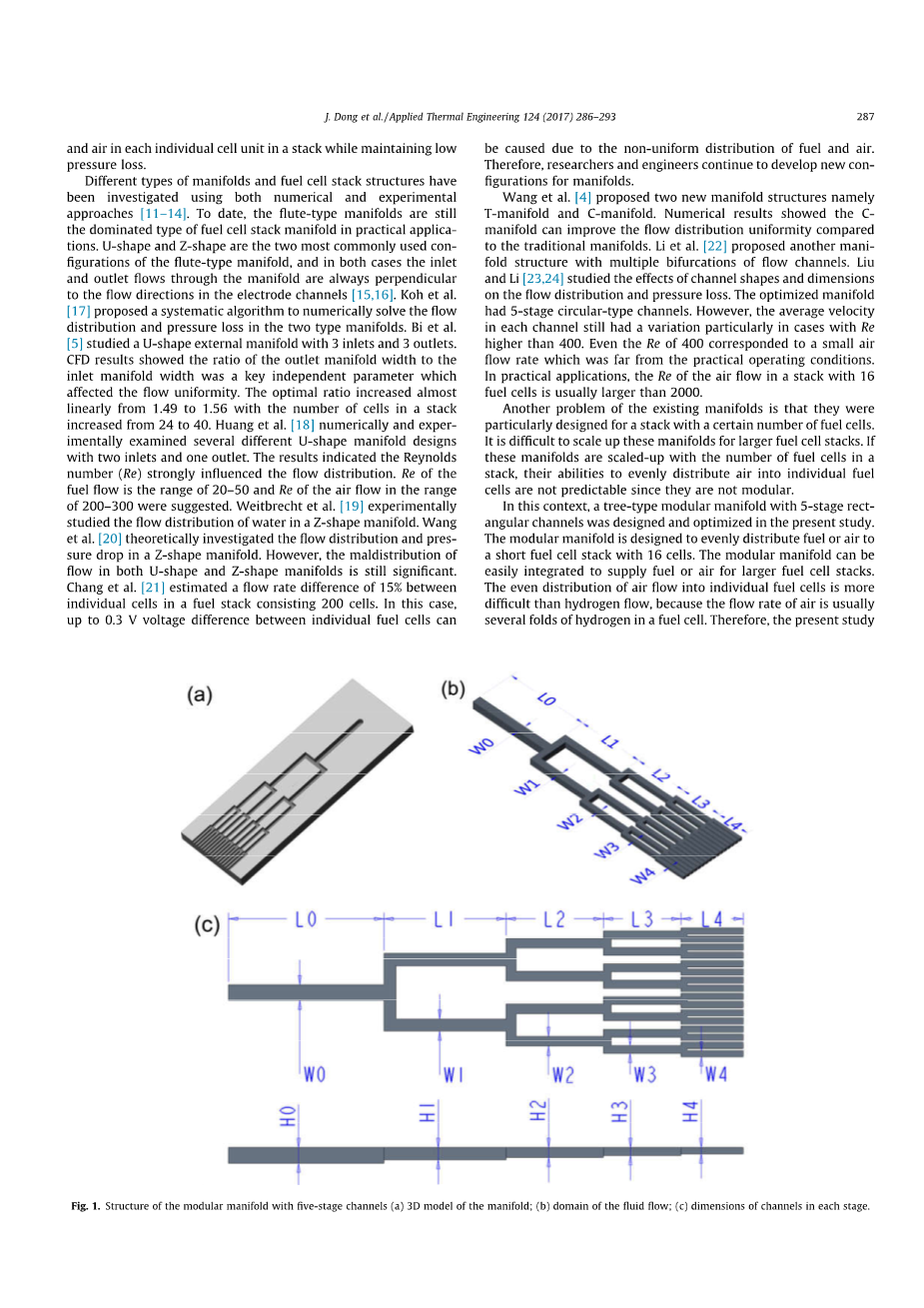 Wang等人[4]提出了两种新的流场结构,分别是T-流形和C-流形。数值模拟的结果表明,与传统歧管相比,C-流形可以改善流动分布的均匀性。Li等人[22]提出了另一种具有多个分叉流道的流道结构。Liu和Li [23,24]研究了通道形状和尺寸对流量分布和压力损失的影响。优化的歧管有5级圆形通道。然而,每个通道的平均速度仍然有变化,特别是在Re高于400的情况下。甚至400的Re对应于与实际操作条件相差甚微的空气流量。在实际应用中,16个燃料电池堆中的空气流量Re通常大于2000。