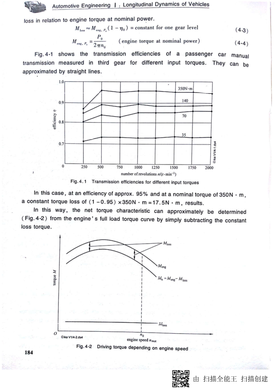 图4-1展示了在不同的输入转矩下,以三档测量的乘用车手动变速器的传动效率。他们可以近似描述为直线。