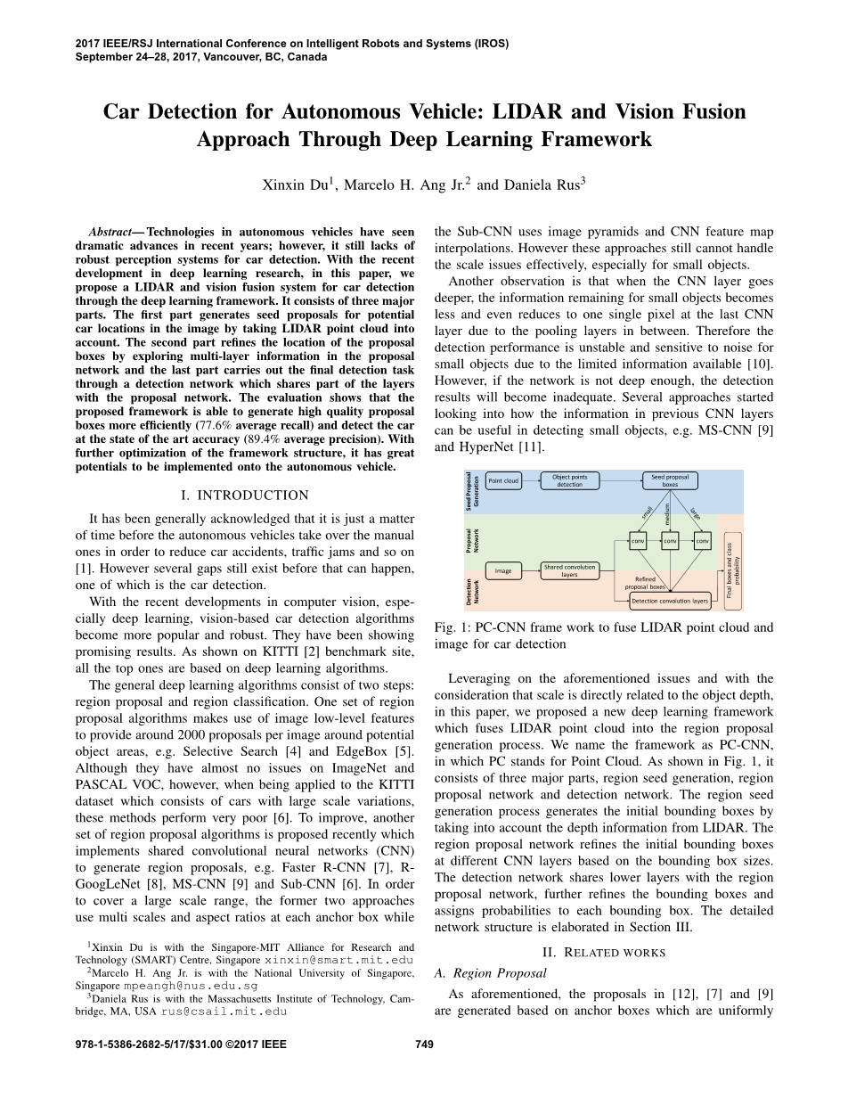 文献中的一些作品也使用3D信息进行区域建议生成。在[14]和[15]中,首先实现了点云分割,将每个分段投影回图像,并将覆盖区域用作进一步检测的提议边界框。不同之处在于[15]实现了三维邻接聚类算法[16],而[14]将分割投影到MRF(马尔可夫随机场)能量最小化。为了进一步提高表现,提案框通过CNN进一步重新排列[17],CNN将视差图和距离考虑在内。但是这些方法强烈地依赖于分割结果,并且倾向于遗漏远处的物体,因为LIDAR只能返回少量点。在我们的方法中,只要物体可以被LIDAR检测到,就可以生成一个合适比例的提案箱。