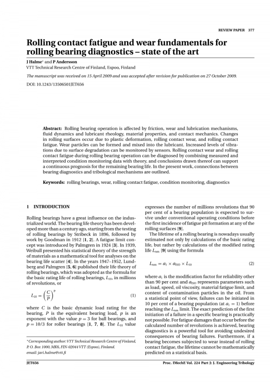 其中C是轴承的基本额定动载荷,P是等效轴承载荷,pis是指数,球轴承的值为p = 3,滚子轴承的压差为p = 10/3 [1,7,8]。 L10值*通讯作者:芬兰VTT技术研究中心,P。 O. Box 1000,MK6,FIN-02044 VTT(Espoo),Finland.email:jari.halme @ vtt.fi表示在第一次操作前的条件下,预计90%的轴承数量将会产生数百万转的转数。 任何热轧表面疲劳坑形成的发生率[9]。