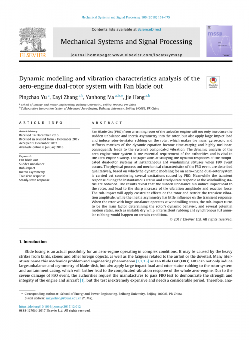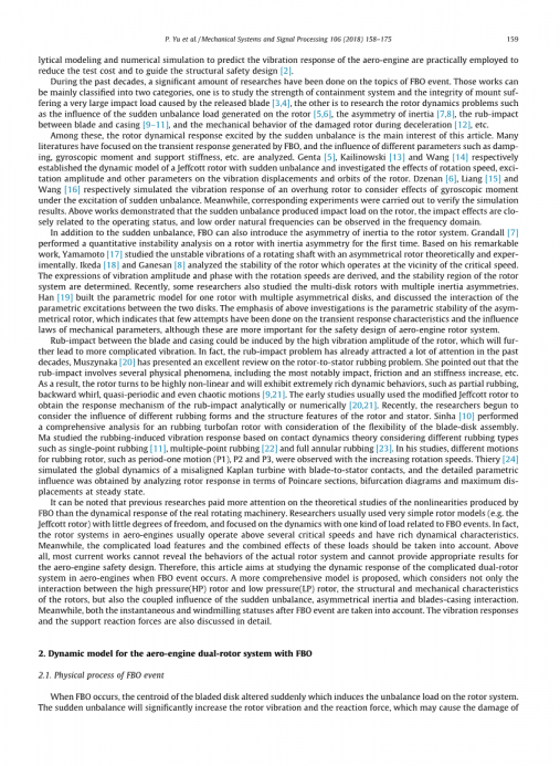 Blade losing is an actual possibility for an aero-engine operating in complex conditions. It may be caused by the heavystrikes from birds, stones and other foreign objects, as well as the fatigues related to the airfoil or the dovetail. Many literatures name this mechanics problem and engineering phenomenon [1,2,15] as Fan Blade Out (FBO). FBO can not only induce large unbalance and asymmetry of blade-disk, but also apply large impact load and rotor-stator rubbing to the rotor system and containment casing, which will further lead to the complicated vibration response of the whole aero-engine. Due to the severe damage of FBO event, the authorities request the manufactures to pass FBO test to demonstrate the strength and integrity of the engine and aircraft [1], but the test is extremely expensive and needs a considerable period. Therefore, analytical modeling and numerical simulation to predict the vibration response of the aero-engine are practically employed to reduce the test cost and to guide the structural safety design [2].