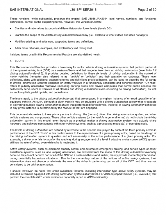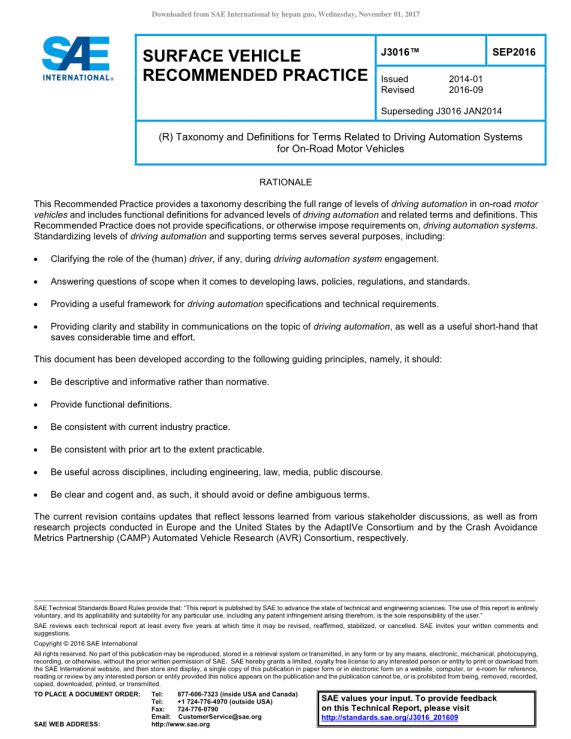 本推荐实施规程为机动车辆驾驶自动化系统提供了分类,该系统持续执行部分或全部动态驾驶任务(DDT),从无驾驶自动化(0级)到完全驾驶自动化(5级)。它为机动车辆(以下简称“车辆”)方面的驾驶自动化的六个级别及其在道路上的运行提供了详细定义。这些级别定义以及本文提供的其他支持术语和定义,可用来以功能一致和连贯的方式描述配备在机动车上的全系列驾驶自动化功能。“公路”是指为各类车辆和驾驶自动化水平(包括无驾驶自动化)的用户以及摩托车手、脚踏自行车手和行人提供集体服务的公共道路(包括停车场和允许公众进入的私人营地)。