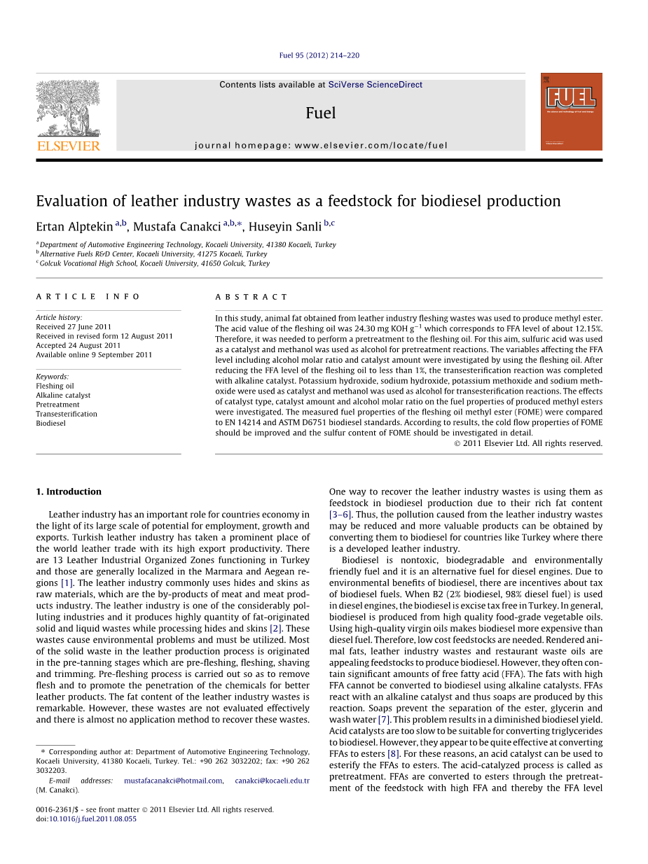 皮革产业因其大规模的就业潜力和出口增长在国家经济中起着重要作用。土耳其皮革工业因其高出口生产率而在世界皮具贸易中占据一席之地。土耳其有13个皮革工业区功能组织,那些工业区通常位于马尔马拉和爱琴区[ 1 ]。皮革工业中常用的皮为原料,这是肉及肉制品的工业副产品。皮革行业被认为是污染工业,在生皮和皮革生产过程中,会产生固体和液体废物[ 2 ]。这些废物造成环境问题,所以必须利用。在皮革生产过程中固体废物主要是来自预鞣过程中的一系列反应,包括剃须和修整。预制皮革的过程中,去除部分皮革,促进化学物质更好地渗透皮革制品。皮革工业废物的脂肪含量显著。然而,这些废物不能有效评价,同时几乎没有回收这些废物的应用方法。由于其丰富的脂肪含量,回收皮革工业废物的方法之一是使用它们作为原料生产生物柴油[ 3-6 ]。因此,皮革工业废物造成的污染可能会减少,产出更有价值的产品,有一个发达的皮革行业的国家,如土耳其,可以将它们转化为生物柴油。
