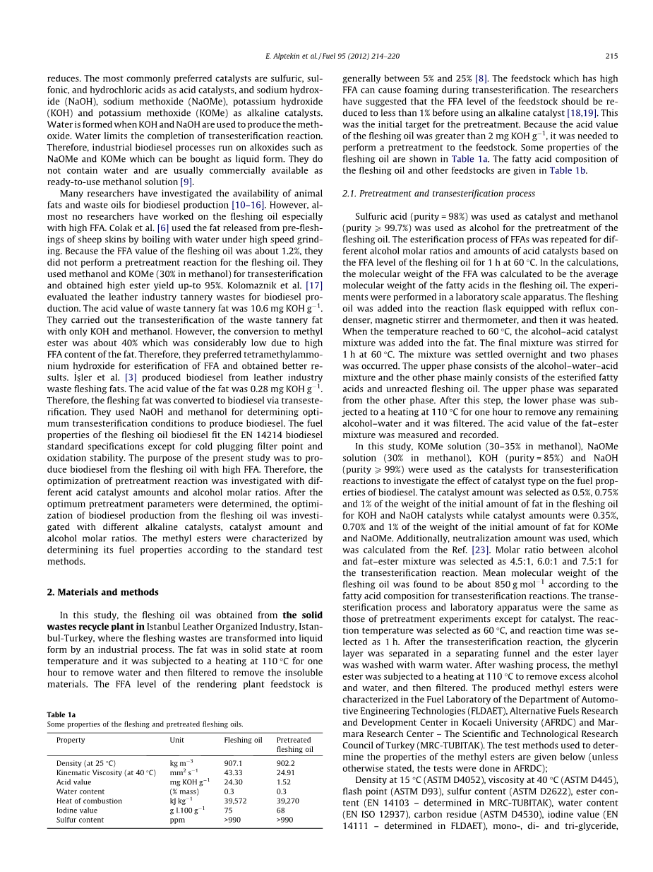 在本项研究中,皮革油来自伊斯坦布尔皮革工业中固体废物回收装置,那里皮革油经过工业流程转化为液体形态。对室温下固态的脂肪在110°C进行加热一小时以除去水,然后过滤除去不溶性物质。该炼油厂原料FFA水平一般在5%和25%之间。[8].在酯交换反应中,具有高FFA的原料可引起发泡。研究人员认为,原料的FFA水平应该再降低到小于1%才使用碱性催化剂。[18,19] 这是预处理的初始目标。由于该皮革油酸值大于2 mg KOH g—1,需要对原料进行预处理。皮革油的一些特性如表1A所示。由皮革油和其他原料组成的脂肪酸特性如表1B所示。