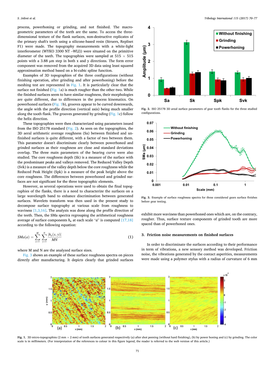 在啮合测试前,三种结构的3D形态的样本(没有处理操作的,在磨削加工或动力研磨)表示在图表1中。没有经过处理的表面比另外两个样本更加粗糙,这一点是十分明显的。但是,经过加工的表面似乎有相同的粗糙度,它们的形态是很不一样的,这一不同产生于不同的加工过程。在经过动力研磨的齿面上,纹路的表现形式为下降的曲线。轮廓面方向的角度(矢量轴)变得更加小自齿面方向。这些纹路是由螺旋方向磨削产生的。