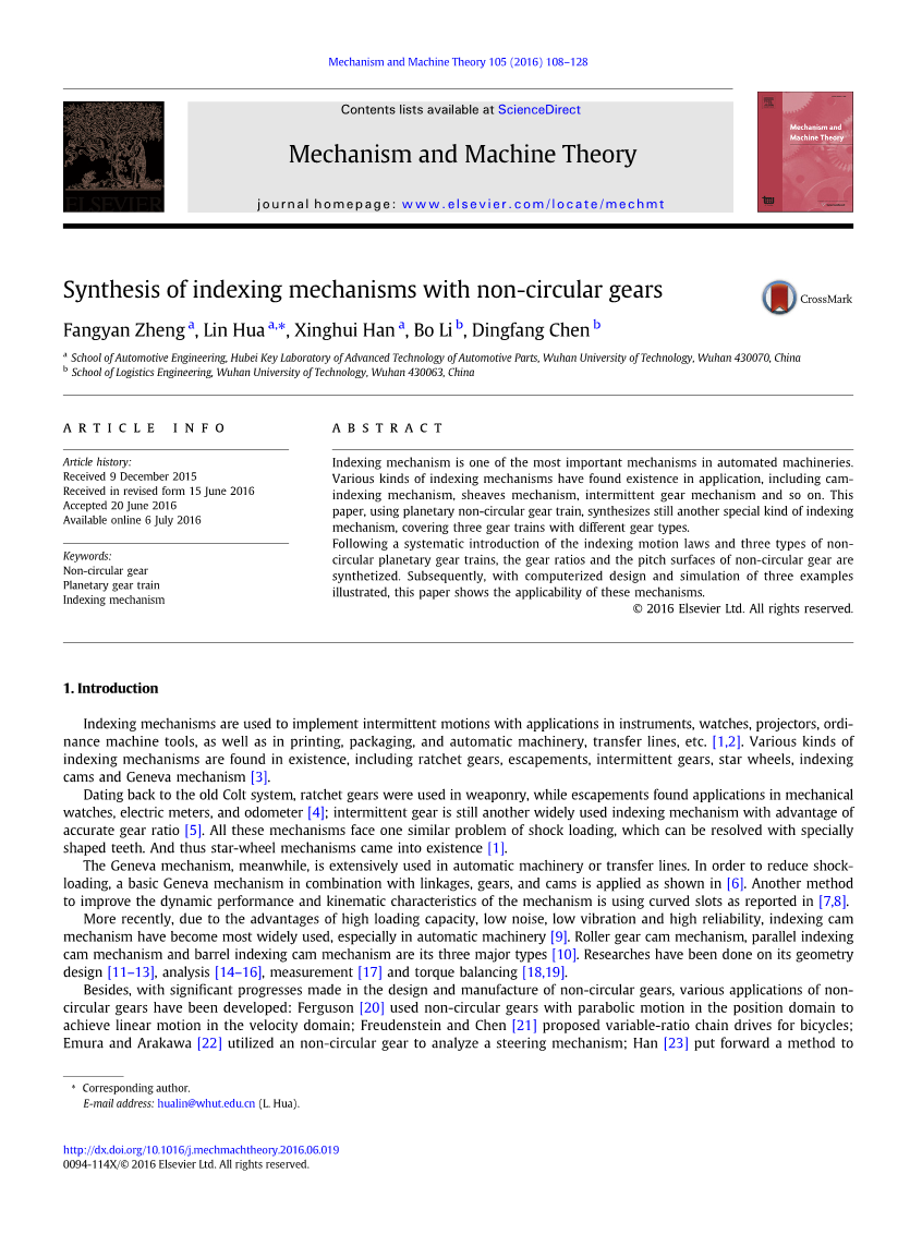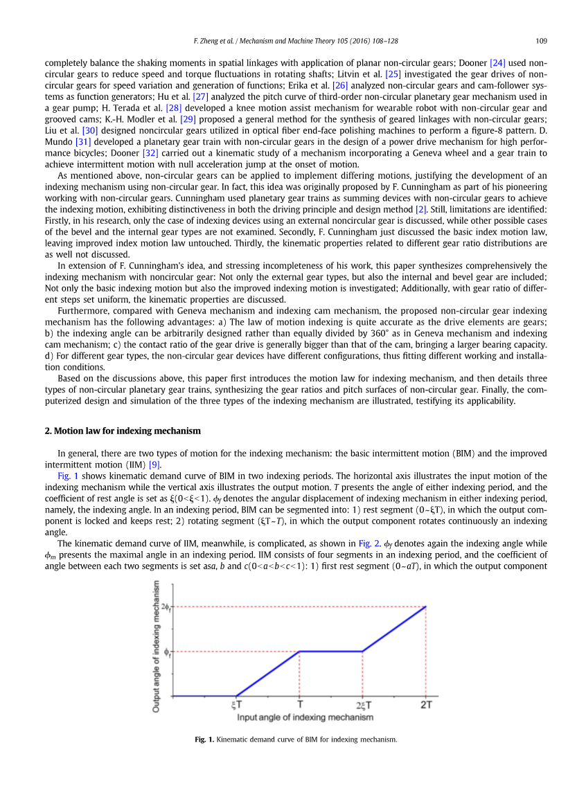 此外,非圆形齿轮的设计和制造取得重大进展,已经开发出非圆形齿轮的各种应用:弗格森[20]在位置域使用抛物线运动的非圆形齿轮,以实现直线运动速度域; Freudenstein和Chen [21]提出了用于自行车的变速比链传动; Emura和Arakawa [22]利用非圆形齿轮来分析转向机构; Han [23]提出了一种在平面非圆齿轮应用中完全平衡空间联动摇摆的方法; Dooner [24]使用非圆形齿轮来减少旋转轴中的速度和扭矩波动; Litvin等[25]研究了非圆形齿轮的齿轮传动,用于速度变化和功能的产生; Erika等人[26]分析了非圆形齿轮和凸轮跟随器系统作为函数发生器;胡等[27]分析了齿轮泵中使用的三级非圆形行星齿轮机构的俯仰曲线; H. Terada等[28]开发了具有非圆形齿轮和凹槽凸轮的可穿戴机器人的膝盖运动辅助机构; K.-H。 Modler等[29]提出了用非圆形齿轮合成齿轮联动的一般方法; Liu et al。 [30]设计了在光纤端面抛光机中使用的非圆形齿轮,以执行图8模式。 D.Mundo [31]开发了一种具有非圆形齿轮的行星齿轮系,用于高性能自行车的动力驱动机构的设计; Dooner [32]对包含日内瓦轮和齿轮系的机构进行了运动学研究,以便在运动开始时实现零加速度跳跃的间歇运动。