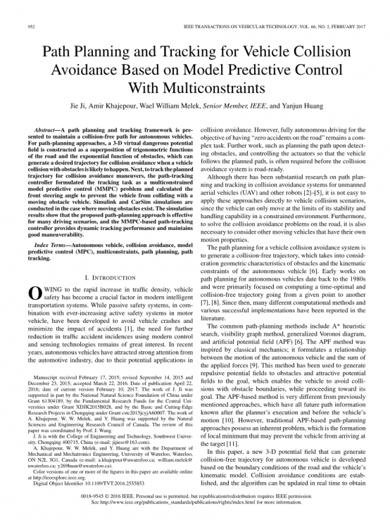 关键词-自主车辆,避碰,模型预测控制(MPC),多约束,路径规划,路径跟踪。