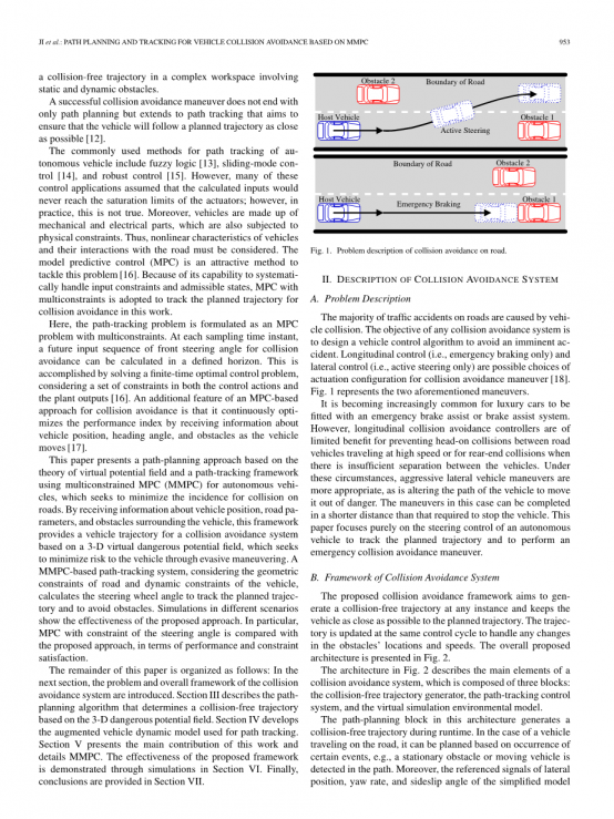 虽然无人飞行器(UAV)和其他机器人的避碰系统中的路径规划和跟踪已经有了大量的研究[2]-[5],但直接对车辆碰撞场景应用这些应用并不容易,因为车辆只能在极限的稳定性和操纵性的限制下,在一个受约束的环境。此外,为了解决碰撞避免在道路上出现问题,也有必要考虑其他具有自身运动特性的移动车辆。