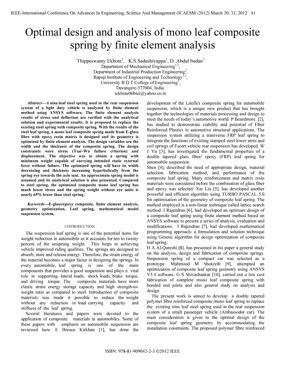 一些文献和论文致力于复合材料在汽车中的应用。其中一些重点是汽车悬架的论文在这里进行了评述。 E Breuce Kirkhan [1],开发了Liteflex汽车悬架复合弹簧,这是一种独特的新产品,汇集了材料加工和设计技术,以满足当今汽车世界的需求。 P Beardmore [2],已经研究证明纤维增强塑料在汽车结构应用中的可行性和潜力。利用横向FRP板簧将现有冲压钢下臂和Escort车辆后悬架的螺旋弹簧的功能集成的悬架系统得到了发展。 W J Yu [3]研究了用于汽车悬架的双锥形玻璃纤维/环氧树脂(FRP)板簧的基本性能。 Shen [4]描述了复合板簧的合适设计,材料选择,制造方法和性能的需要。在选择玻璃纤维和环氧树脂的组合之前,考虑了许多增强材料和基质树脂材料。 Xin Liu [5]使用TURBO PASCAL 5.0开发了另一种功能强大且高效的算法,用于优化复合材料板簧的几何形状。采用的方法是称为格搜索方法的非线性技术。 I Rajendran [6]利用基于ANSYS软件的有限元方法开发了复合材料板簧的优化设计,进行了一系列的分析,评估和修改。 I Rajendran [7]开发了数学规划方法 - 一种使用遗传算法进行复合材料板簧设计优化的配方和求解技术。 H A Al-Qureshi [8]在他的论文中提出了关于复合弹簧分析,设计和制造的一般性研究。选择紧凑型汽车的悬架弹簧作为原型。 Mahmood M Shokreih [9]尝试使用ANSYS VS.4软件优化复合材料板簧几何。 G S Shivashankar [10]进行了低成本的完整单叶复合弹簧的制造,该弹簧具有粘接端接头,并且还进行了分析和设计的一般研究。