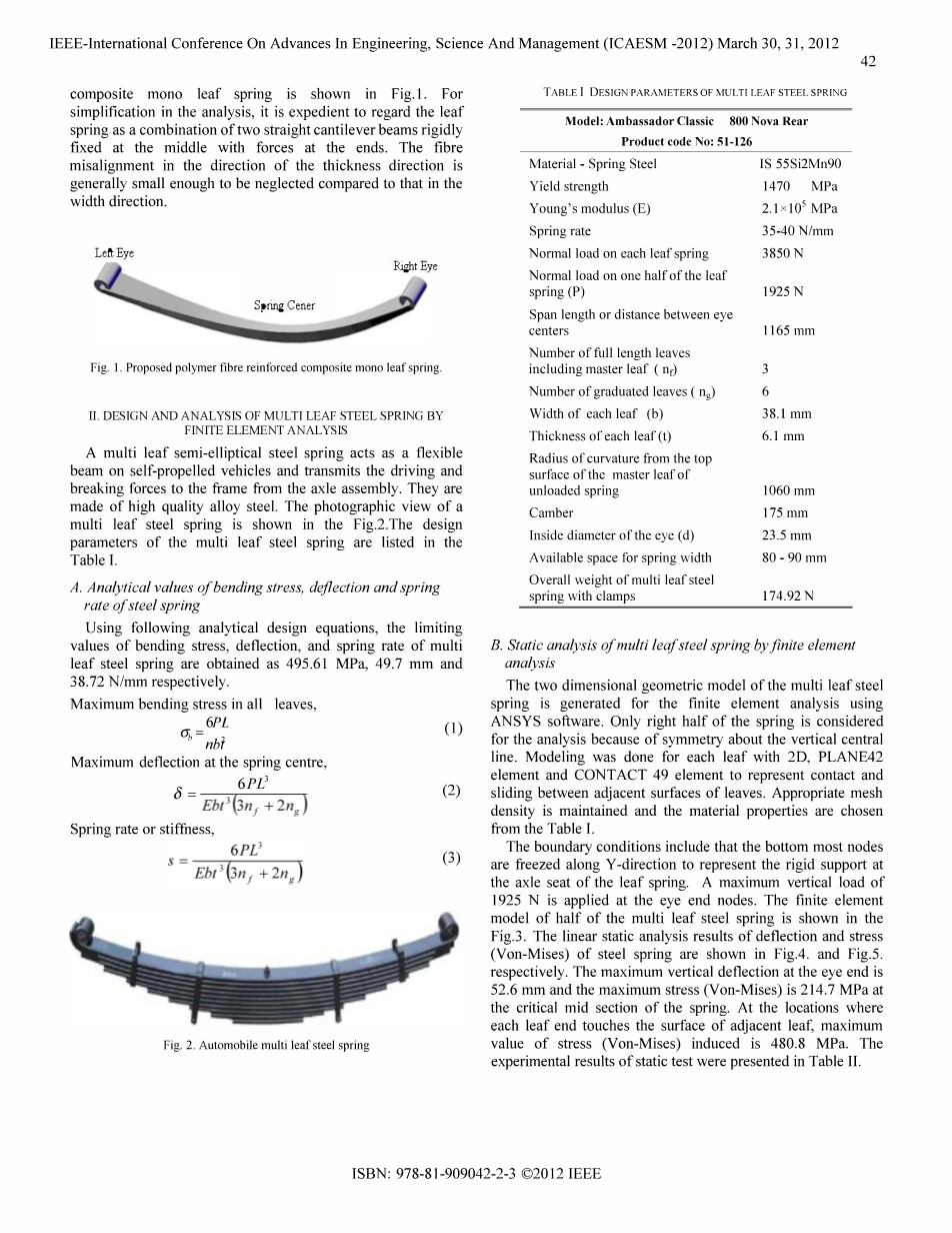 使用以下分析设计方程,多叶钢弹簧的弯曲应力,挠度和弹簧刚度的极限值分别为495.61 MPa,49.7 mm和38.72 N / mm。