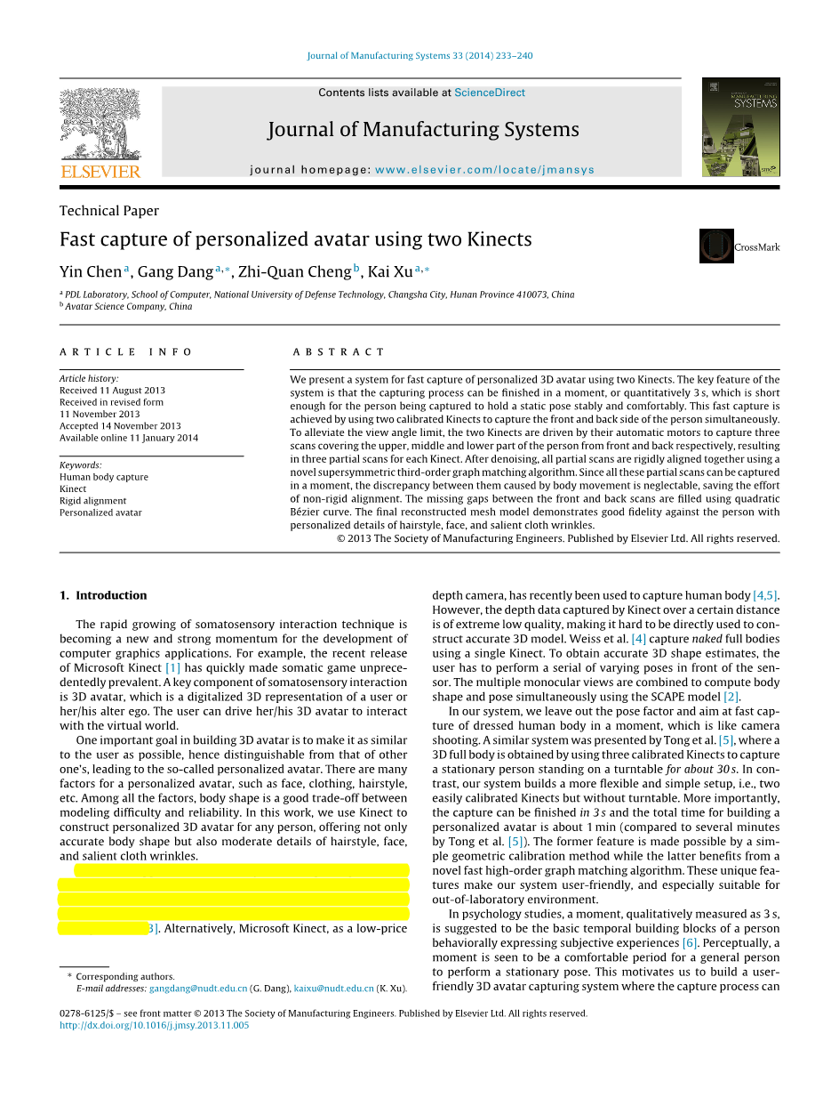摘要:我们提出了一个使用两个Kinect快速捕获个性化3D人体的系统。该系统的关键特征在于捕获过程可以在3秒的时间内瞬间完成,这足以使被捕获的人稳定且舒适地保持静态姿势。通过两个校准的Kinect同时捕获人的正面和背面来实现这种快速捕获。为了减轻视角限制,两个Kinect由它们的自动马达驱动,分别从正面和背面捕获覆盖人体上、中、下三个部分的扫描信息,使每个Kinect都进行三次局部扫描。在去噪之后,使用新型超对称三阶图匹配算法将所有局部扫描刚性地对准在一起。由于这些局部扫描信息都可以在瞬间被捕获,因此由身体运动引起的差异可忽略,从而节省了进行非刚性对准的时间。使前后扫描之间缺失的间隙用二次贝塞尔曲线填充。最终重建的网格模型较好的保留了人的发型,面部特征以及皱纹等个性化细节。